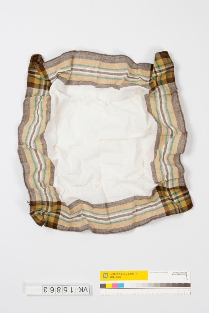 Weißes Stofftaschentuch mit braunen und blauen Streifen am Rand, die sich in den Ecken kreuzen.