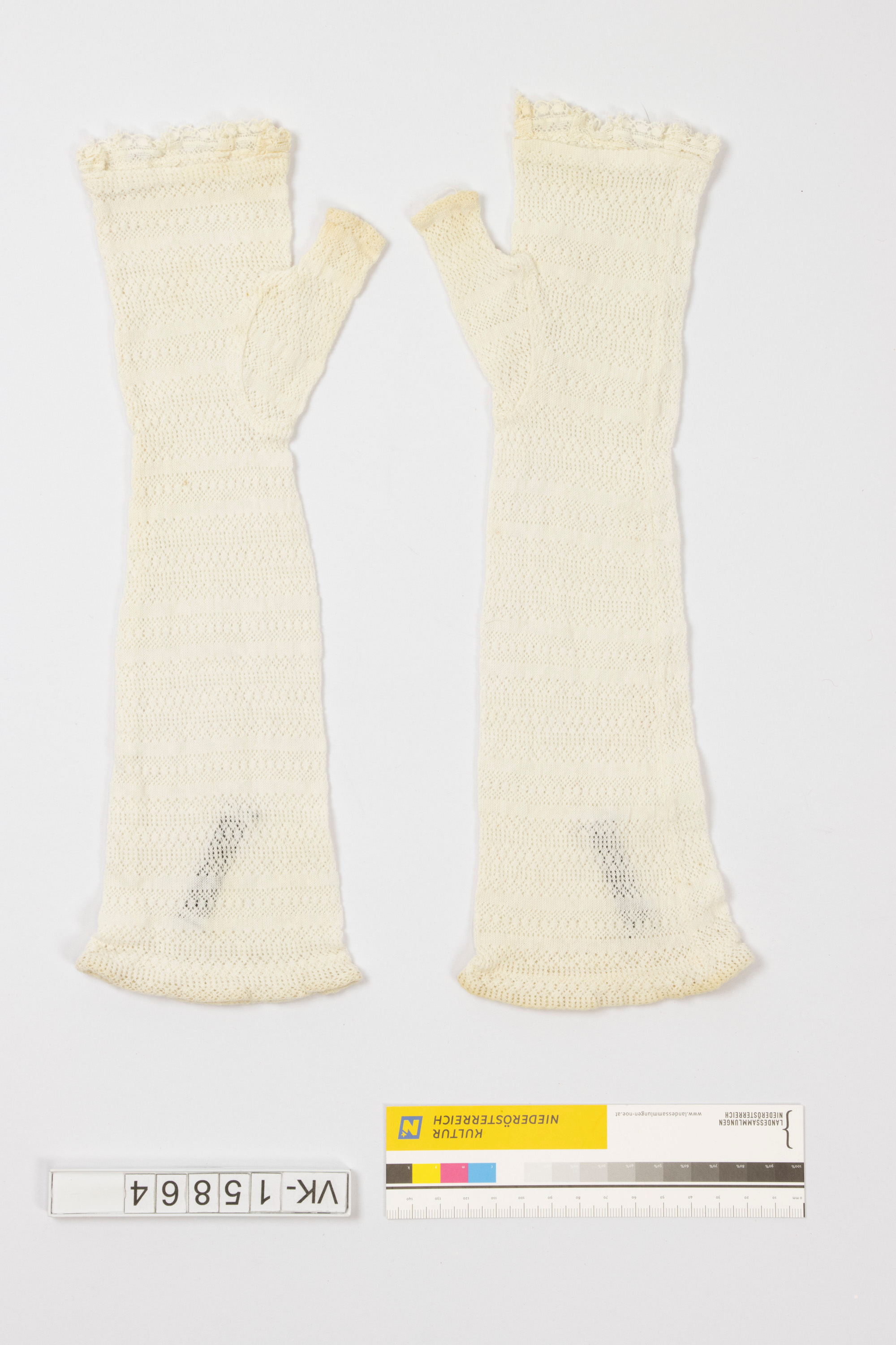 Ein Paar (a, b) aus weißem Garn gestrickte, gemusterte Halbhandschuhe mit Daumen und einer weißen Spitze am unteren Abschluss.