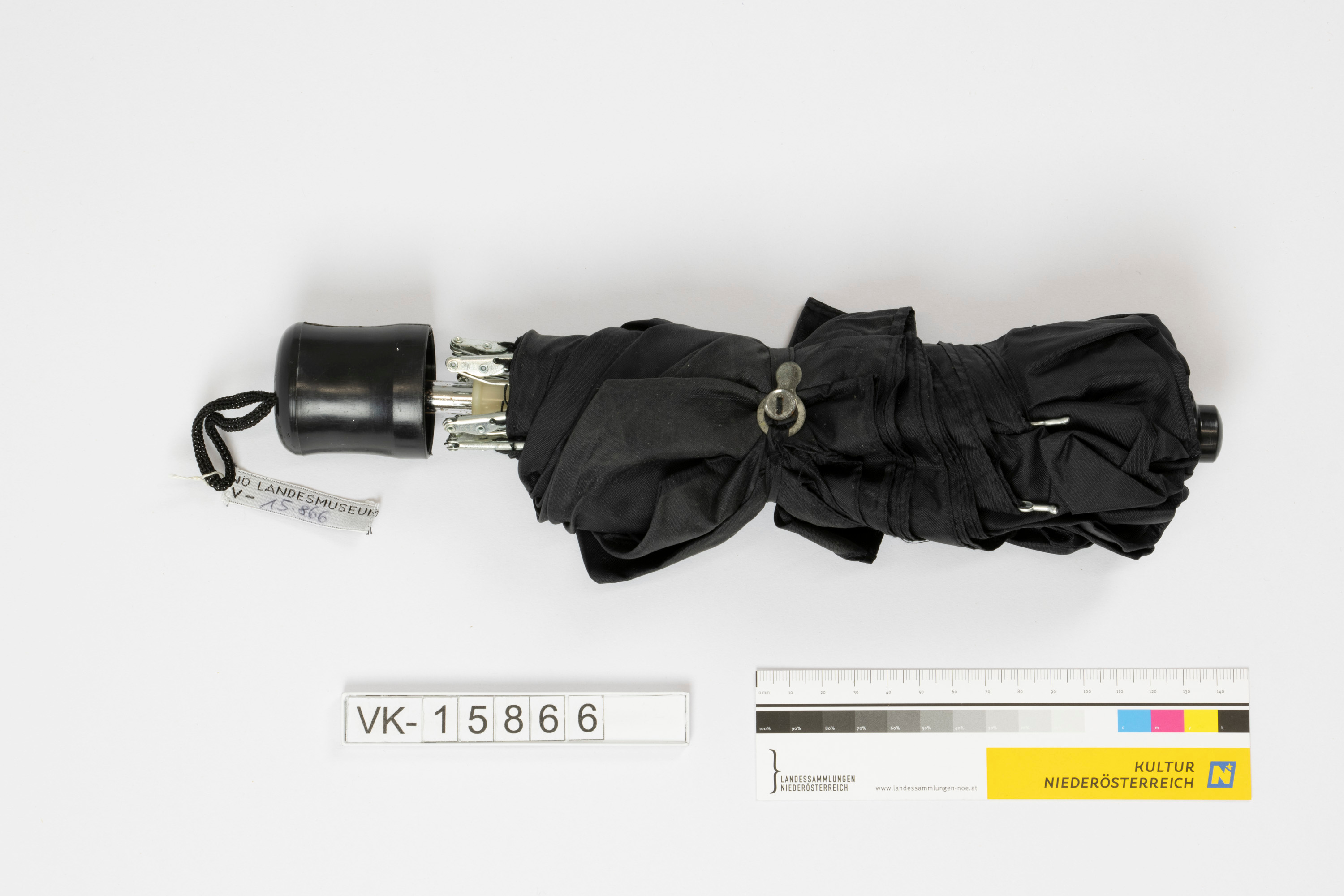 Faltbarer Taschenschirm mit schwarzer Bespannung, Metallgestänge und - stock. Der schwarze Knauf und der Schieber sind aus Kunststoff.