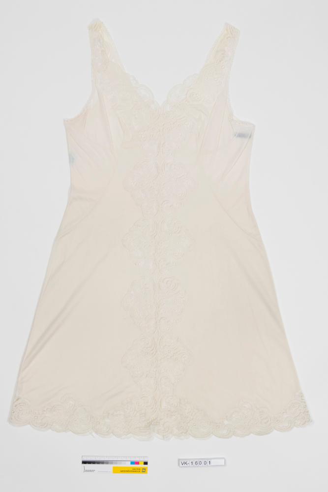 Weißes Satinunterkleid (Negligé) mit Spitzenträgern, Spitzenbesatz an der Unterkante und längs gezackt verlaufendem Spitzeneinsatz über die ganze Länge. Die Spitze ist floral gemustert.