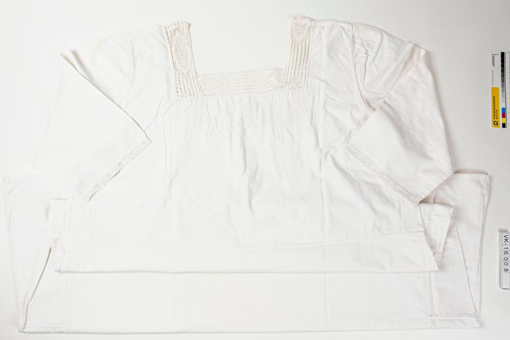 Kurzärmeliges, weit geschnittenes, weißes Nachthemd mit eckigem Halsausschnitt und geometrisch gemustertem, weißem Spitzenbesatz im Ausschnitt und an den Ärmelabschlüssen.
