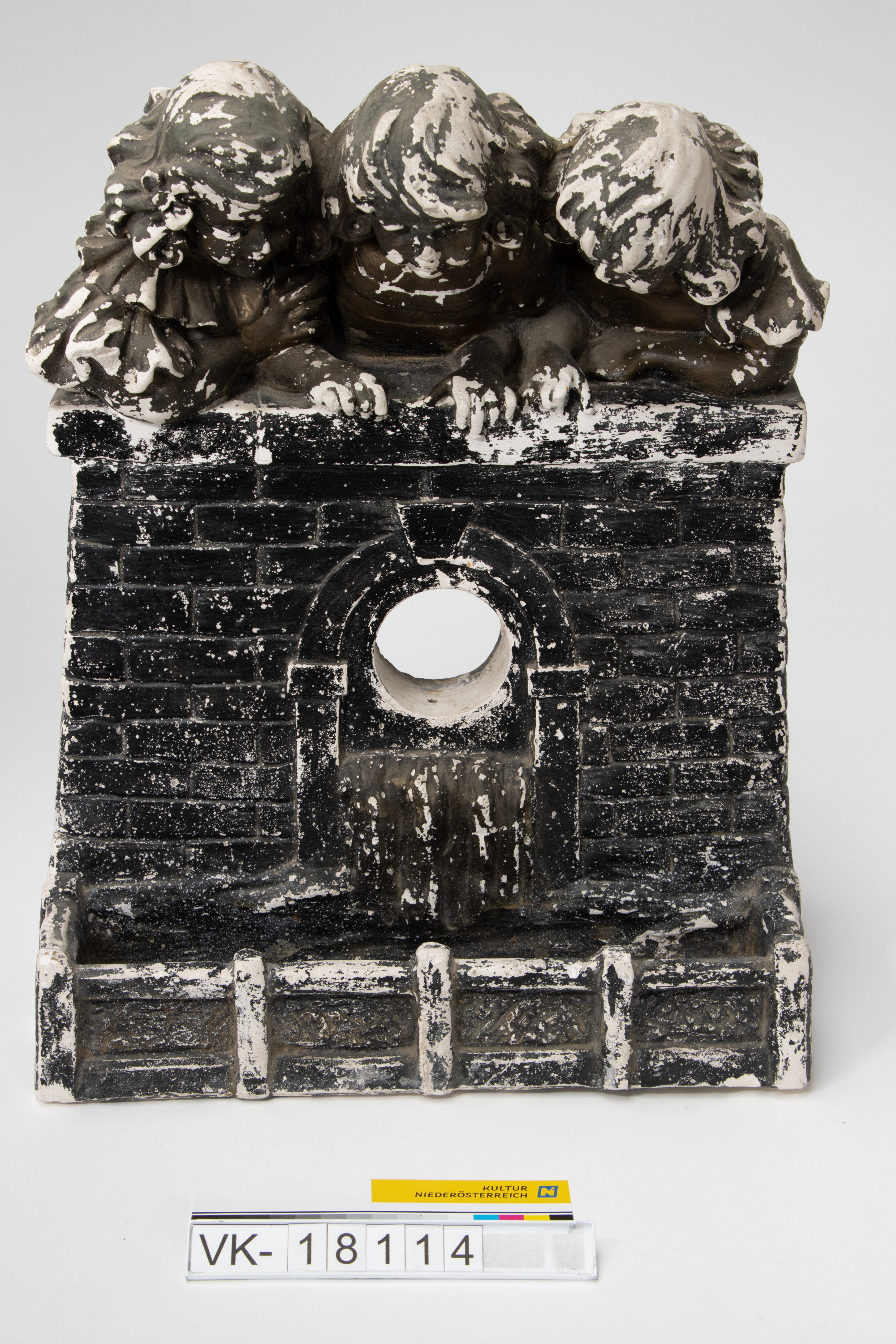Vierfüßiges Untergestell eines sehr kleinen Möbels (möglicherweise Zier- oder Spielmöbel). Die vier Füße sind mit Streben verbunden, es befinden sich Nuten zum Einschieben von vertikal eingesetzten Holz- oder Glasplatten an Füßen und Streben.