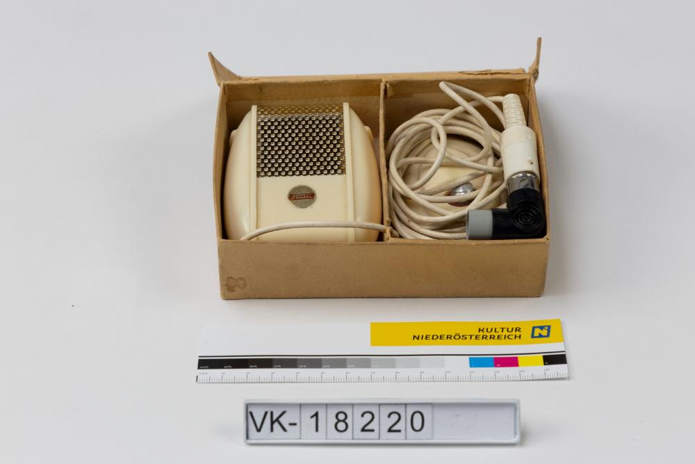 Standmikrofon (VK-18220a) mit Ständer (VK-18220b) aus weißem Kunststoff mit Messinglochblech, dazu ein Kabel mit Stecker (Fa. Hirschmann) und eine passende Pappschachtel (VK-18220c). Das Mikrofon ist bedruckt: Ein Markensymbol und "MADE IN AUSTRIA".