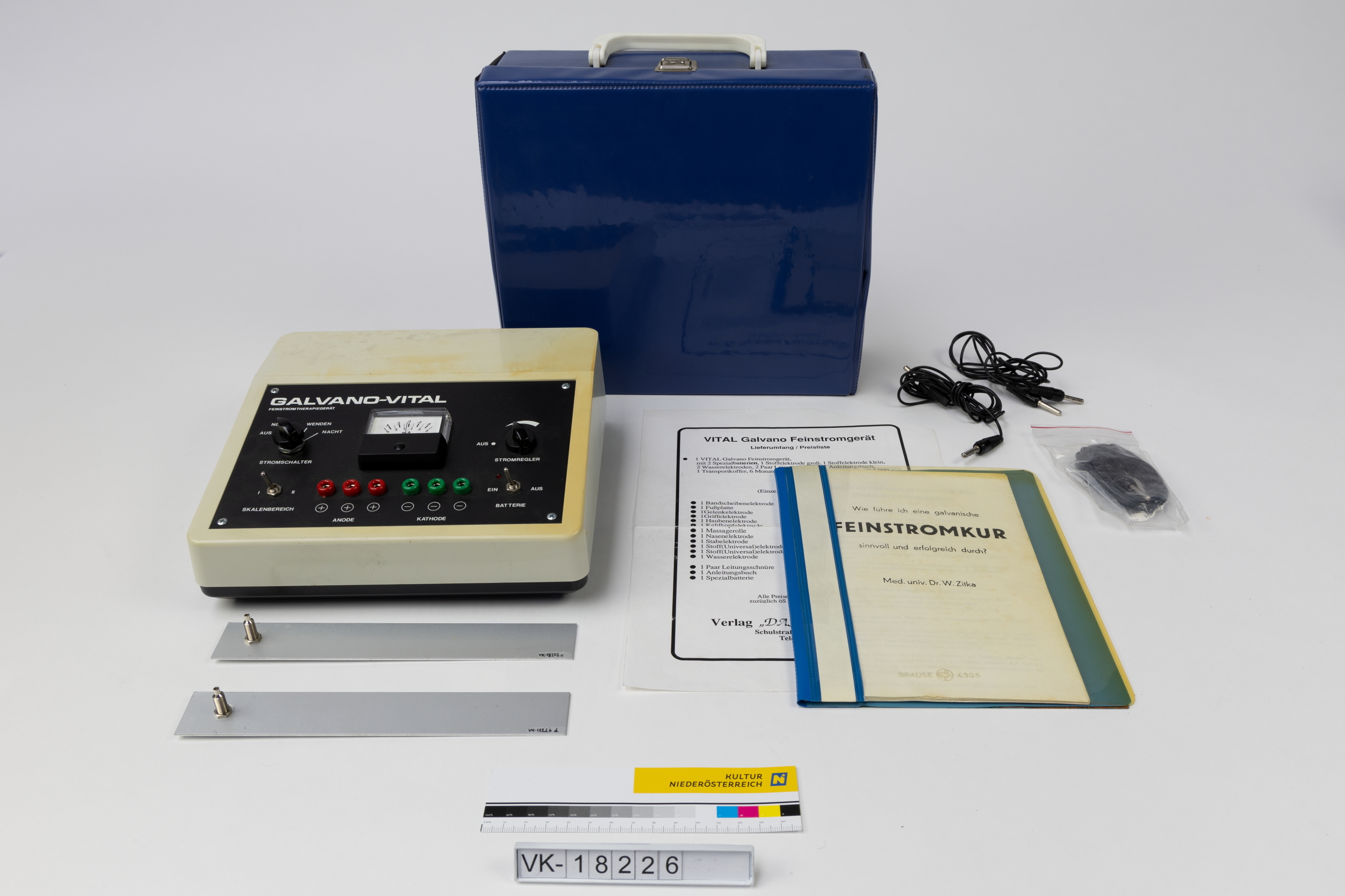 Stromtherapiegerät "GALVANO-VITAL" (VK-18226a) aus weißem Kunststoff mit schwarzer Bedienfläche (Regler, Anschlüsse, Schalter, Amperemeter) in einem blauen Köfferchen (VK-18226b), dazu Kabel (VK-18226e-VK-18226g), Elektroden mit Stoffüberzug (VK-18226k und VK-18226l), eine Anleitung (VK-18226h), ein Prospekt (VK-18226i) und eine Preisliste (VK-18226j).