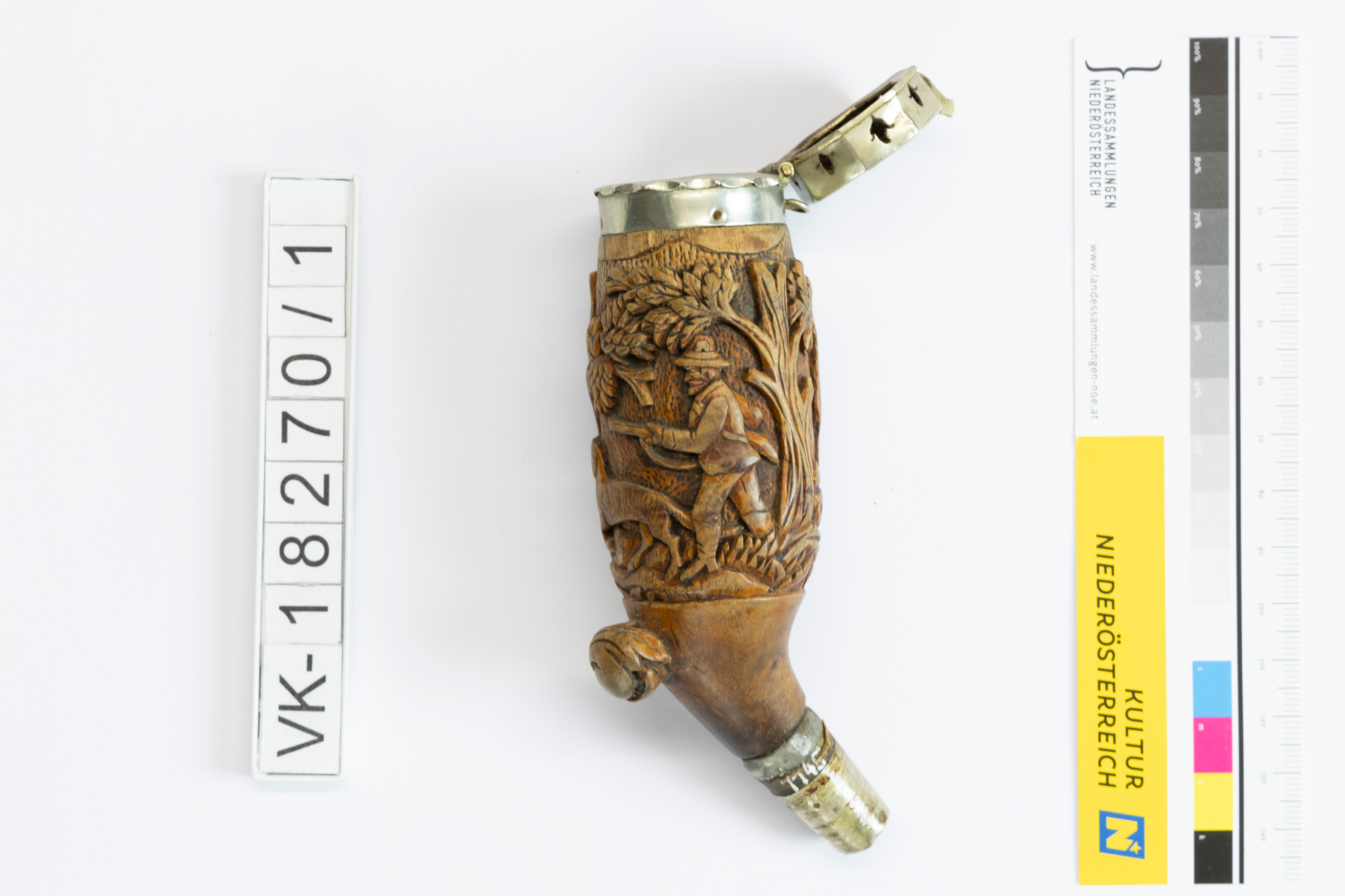 Hölzerner beschnitzter Pfeifenkopf (Halbrelief) mit silbernem Klappdeckel und Konus. Die Schnitzerei zeigt ein Jagdmotiv im Wald mit Jäger, Hund und Hirsch.