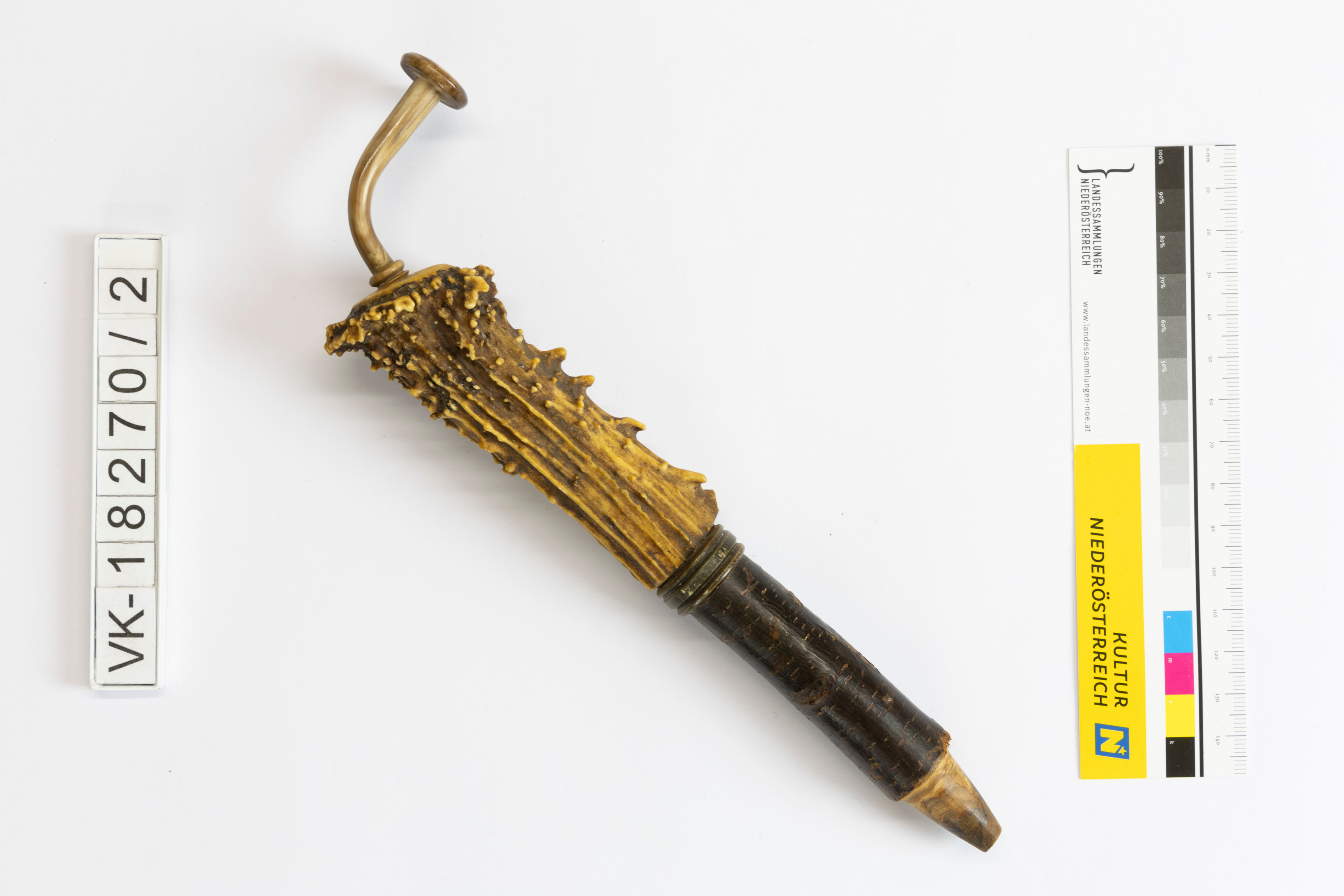Rohr einer Gesteckpfeife mit gebogenem Mundstück; der untere Bereich des Rohrs ist aus Holz (mit Rinde), der obere Bereich aus einem naturbelassenen Geweihstück.