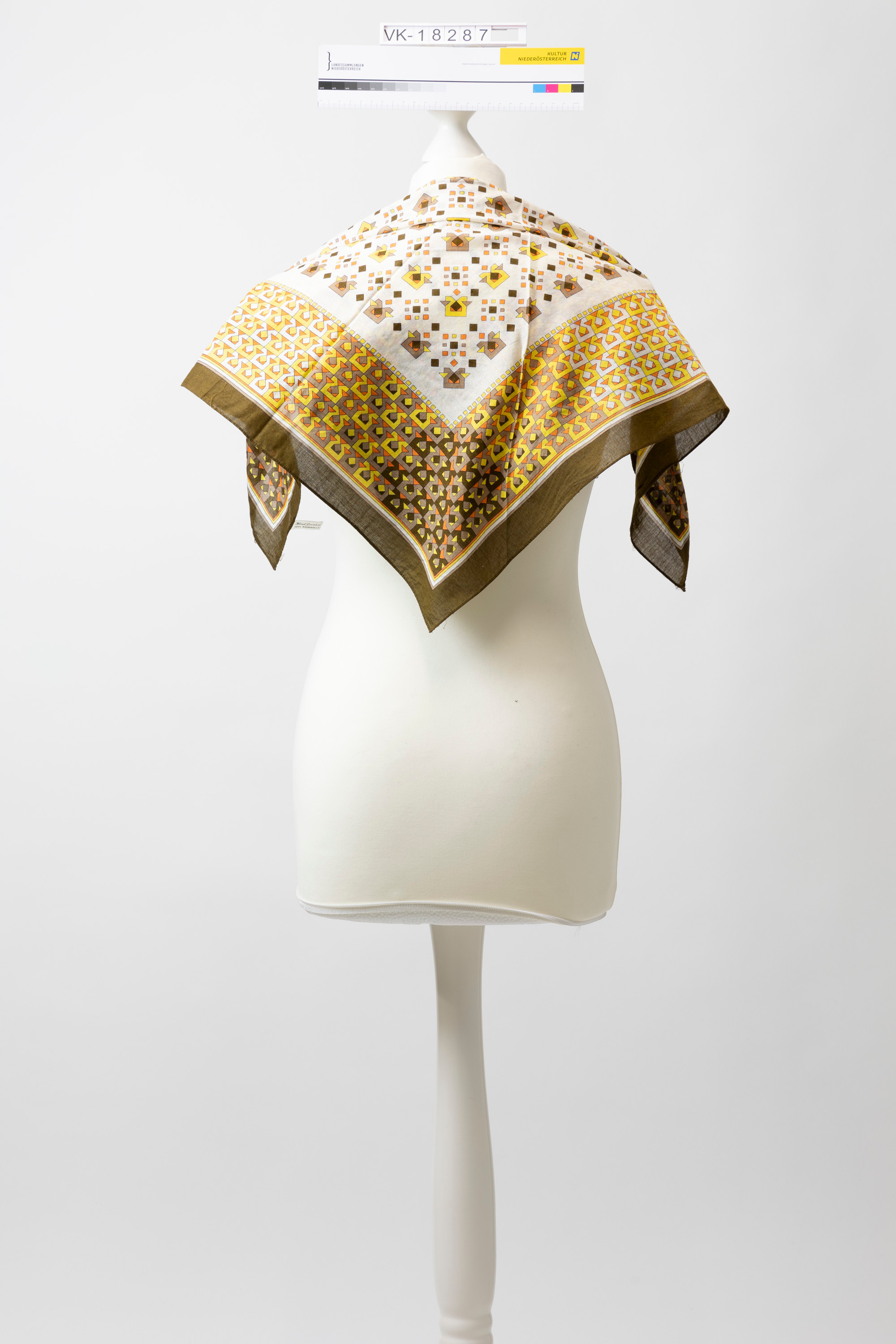In Brauntönen sowie gelb und orange geometrisch gemustertes Kopftuch mit dunkelbraunem Rand.