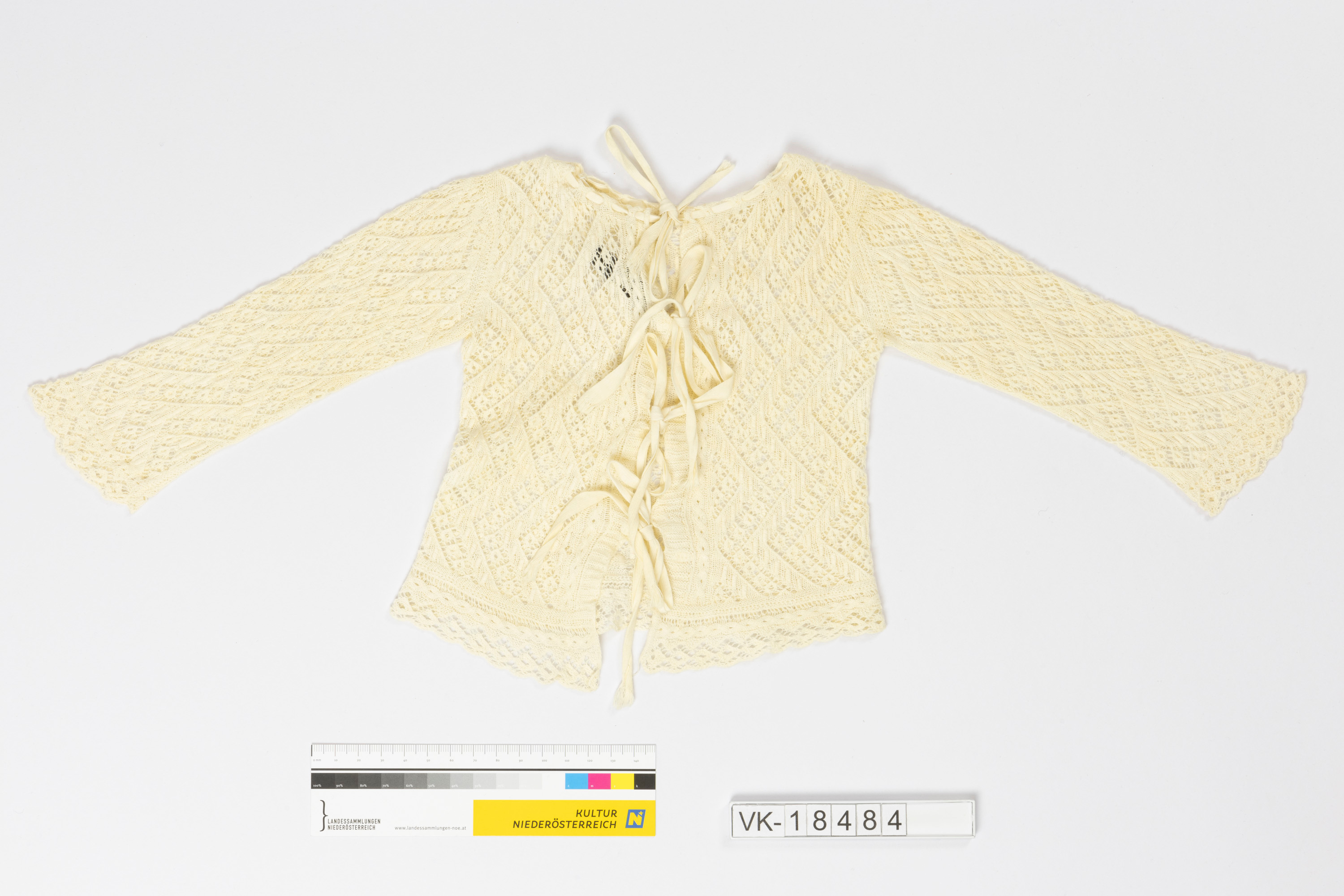 Langärmeliges beiges Babyjäckchen, im Zackenlückerlmuster gestrickt, mit Bindebändchen auf der Rückseite, einem Zugbändchen am Halsausschnitt und Zackenspitzenbesatz an den Abschlüssen.
