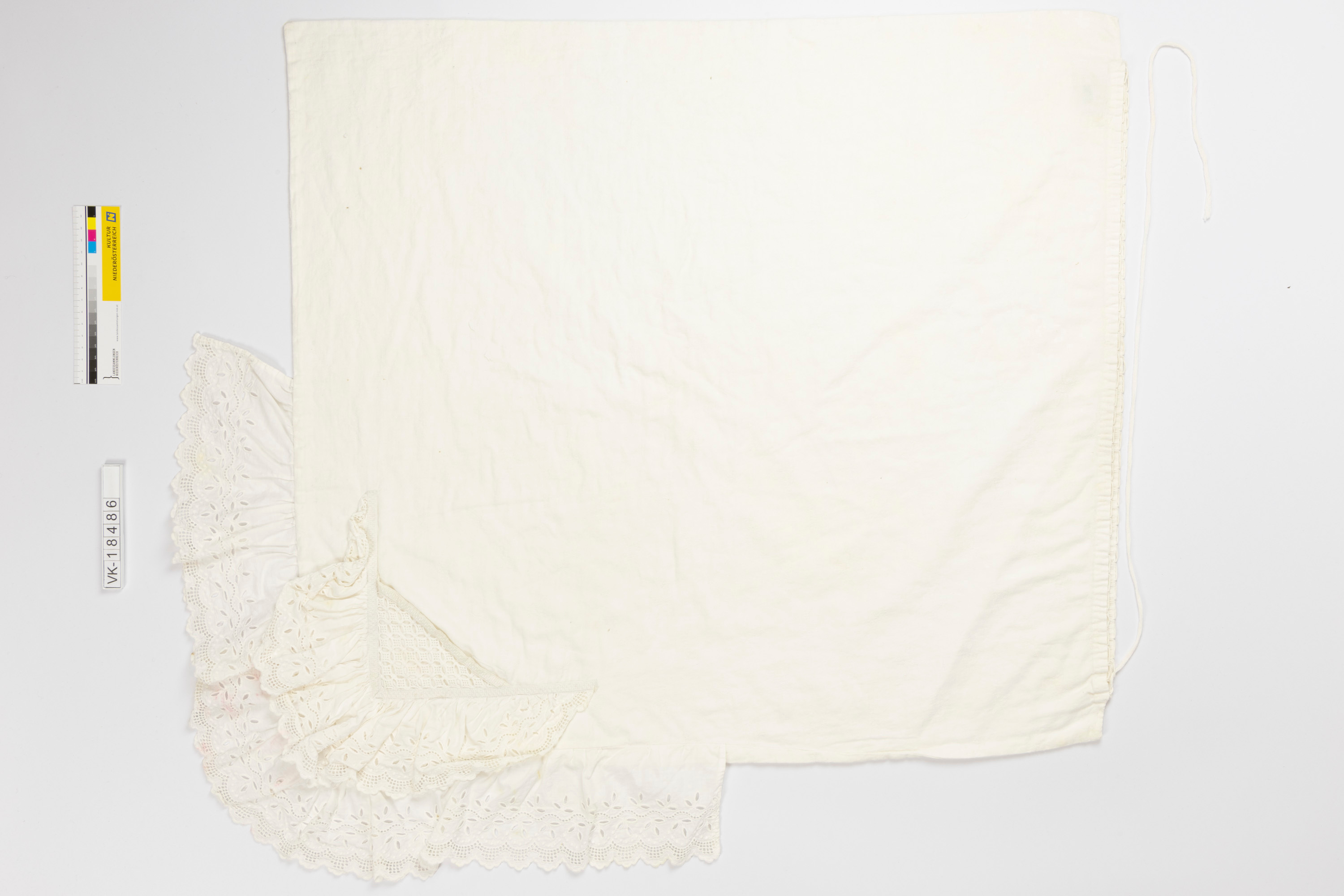Annähernd quadratische Babydecke aus Baumwolle mit eingearbeitetem Zugbändchen, an einem Eck in zwei Lagen mit teilweise gefältelter Wäschespitze besetzt.