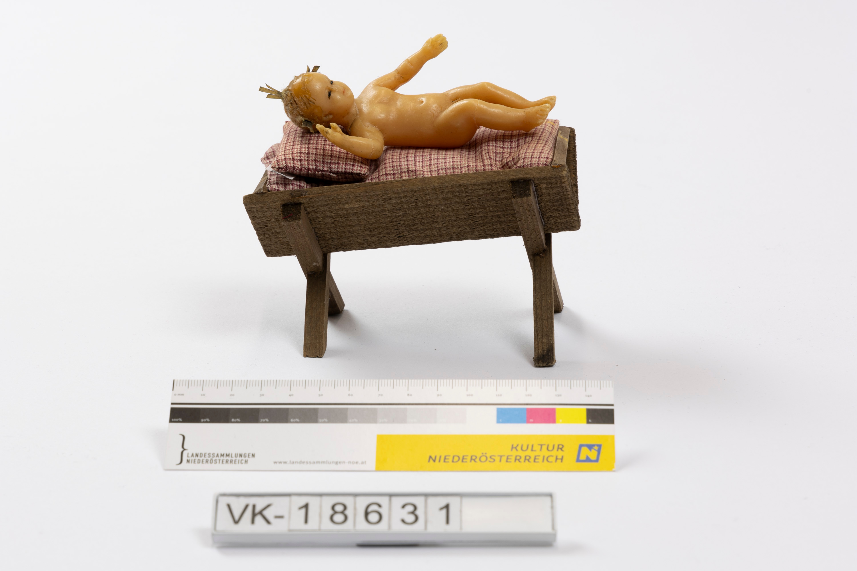 Krippe: Jesuskind aus Wachs (VK-18631a) in einer Holzkrippe (VK-18631b) mit rot-weiß karierter Bettwäsche, bestehend aus einem Polster (VK-18631c) und einer Decke (VK-18631d).