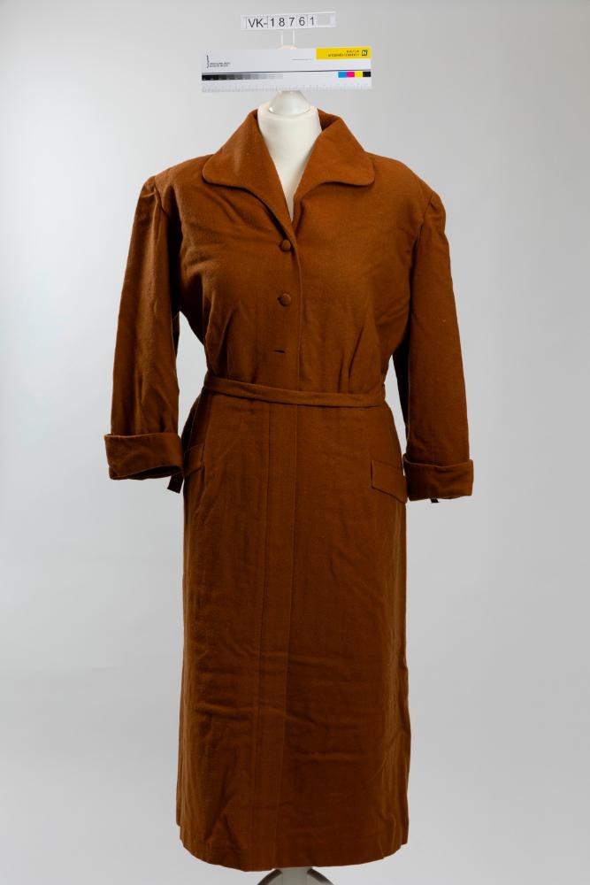 Gerade geschnittenes, langärmeliges, braunes Kleid mit Stoffknöpfen und einem breiten Kragen. Das Kleid hat Ärmelstulpen, aufgesetzte Taschenimitationen und einen Stoffgürtel.