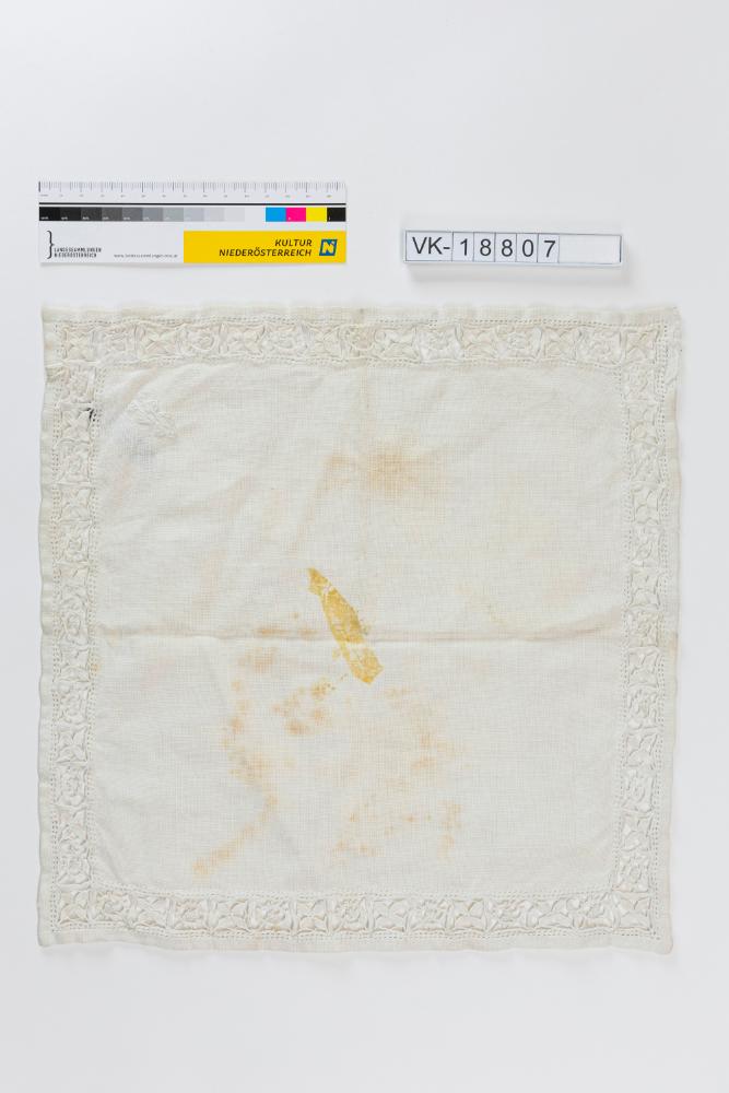 Quadratisches weißes Leinendeckchen mit einer umlaufenden ornamentalen Spannstickereiborte. Das Deckchen hat eine Monogrammstickerei: "AS".