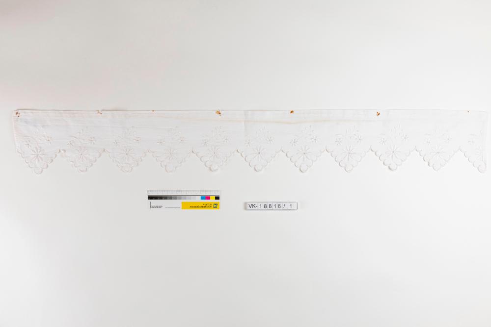 Weißes Kastenband aus Leinen, mit gezackter Bogenkante und einem einfachen floralen Wäschestickereimuster.