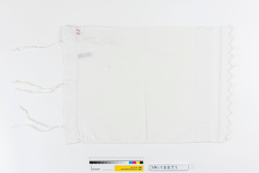 Weißer Leinenpolsterüberzug für einen Zierpolster mit Bindebändchen, an einer Schmalseite mit einer Bogenkante und zwei Ajourborten verziert. Der Polsterüberzug hat ein aufgenähtes Stofffleckchen mit roten Initialen: "TL".