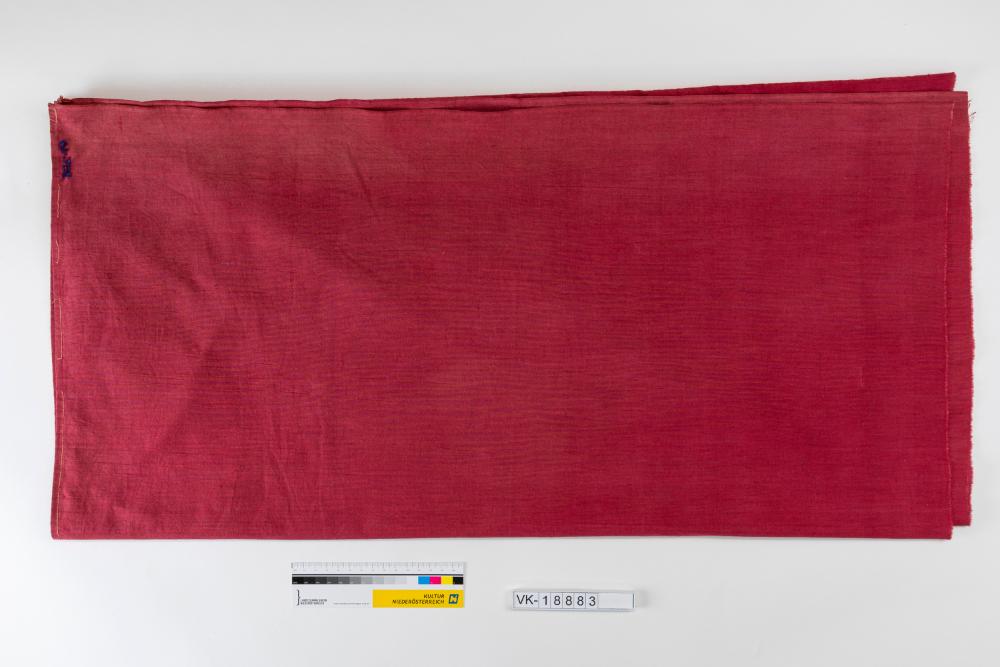 Roter Leinenstoff, aus zwei Teilen zusammen gesetzt, an einer Ecke mit blauem Garn bestickt.
