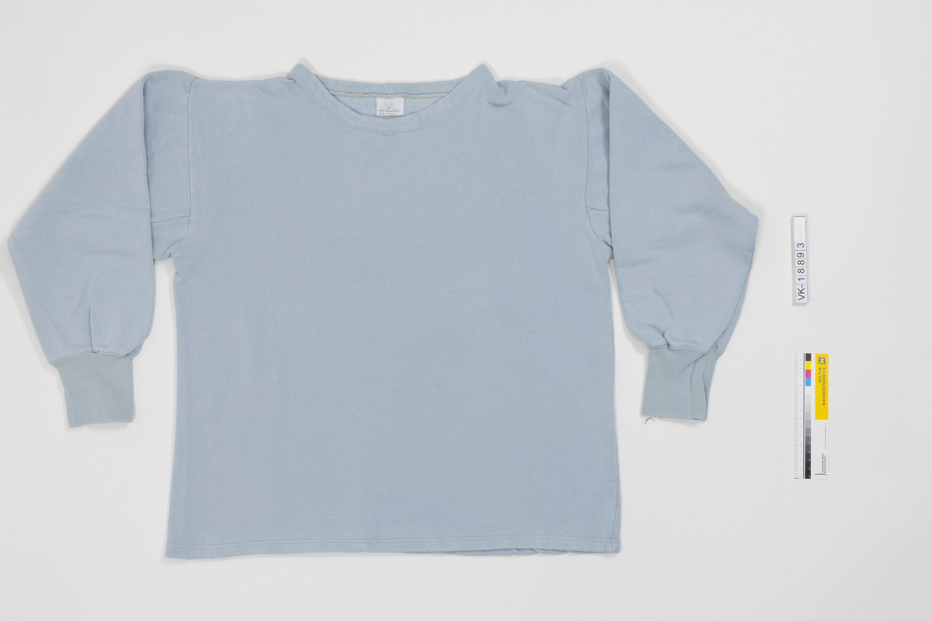 Hellblaugrüner Pullover (Sweatshirt) mit rundem Halsausschnitt und Bündchen an den Ärmeln, aus Baumwollmischgewebe.