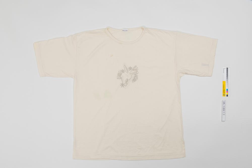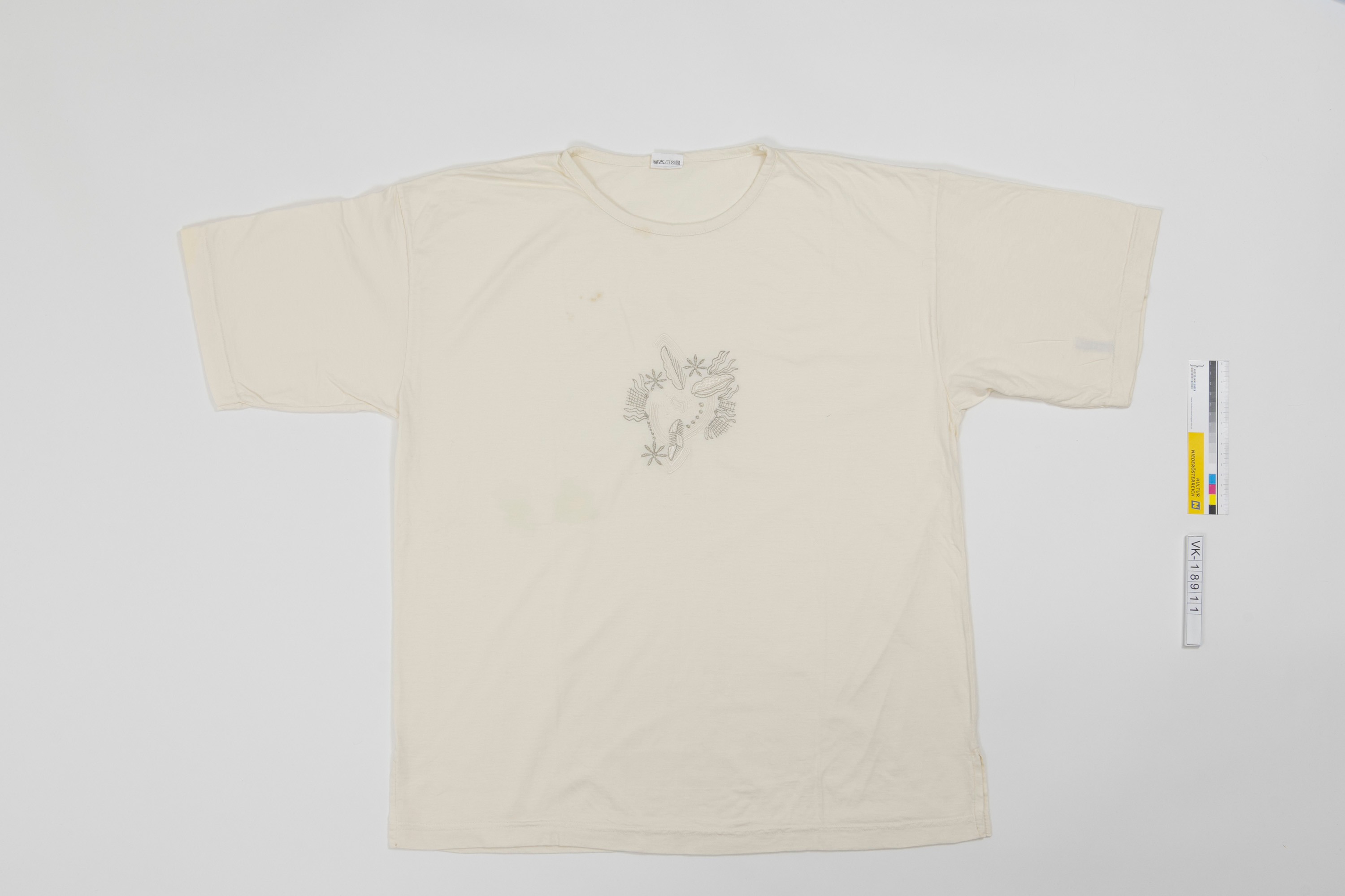 Beiges Baumwollleibchen (T-Shirt) mit kurzen Ärmeln und einem maschinell aufgestickten Motiv auf der Brust (möglicherweise Seesterne und Muscheln, stilisiert).