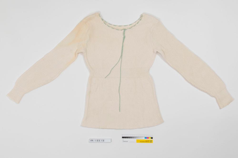 Weißer, langärmeliger, stark taillierter Damenpullover mit weitem rundem Halsausschnitt; der Halsausschnitt schließt mit Bogenschlaufen ab, durch die ein hellblaues Wollbändchen gefädelt ist.