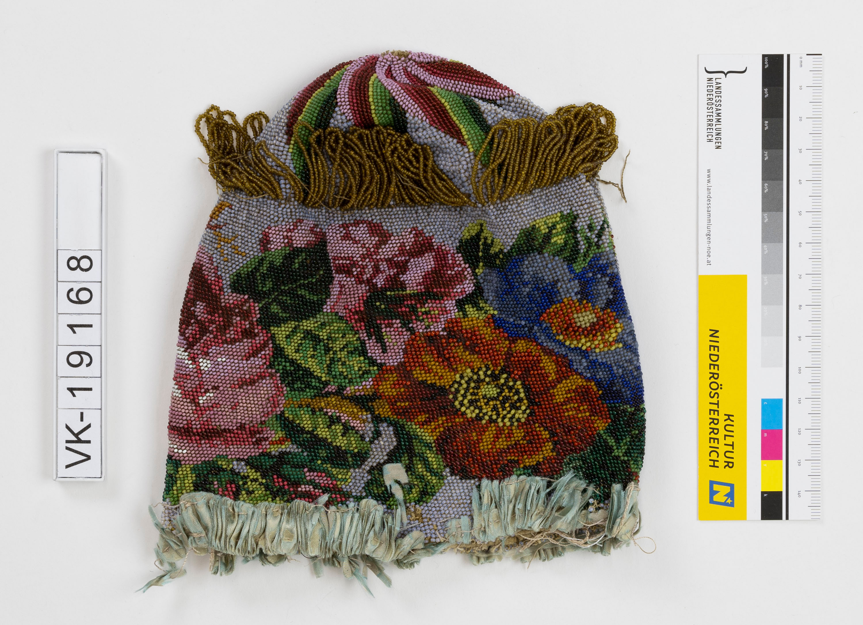 Vollständig mit Glasperlen bestickter Tabaksbeutel (mehrfärbig dargestellte Blüten, im unteren Bereich Glasperlenschlingen in braun, am unteren Abschluss mehrfärbiges Muster). Der Beutel war wohl mit einem Zugband versehen und hat Reste von einem ehemals blauen Stofffutter.