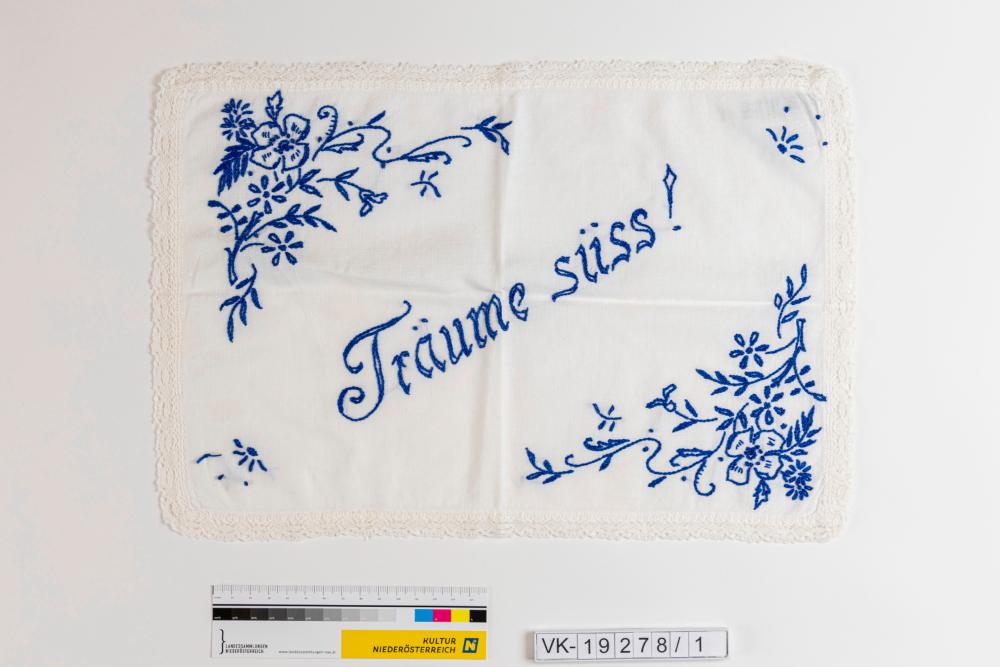 Rechteckiges weißes Leinendeckchen für ein Nachtkästchen, umlaufend mit einer weißen Spitzenborte besetzt, blau bestickt: Florale Motive in zwei Ecken, dazwischen schräg verlaufend: "Träume süss!"
