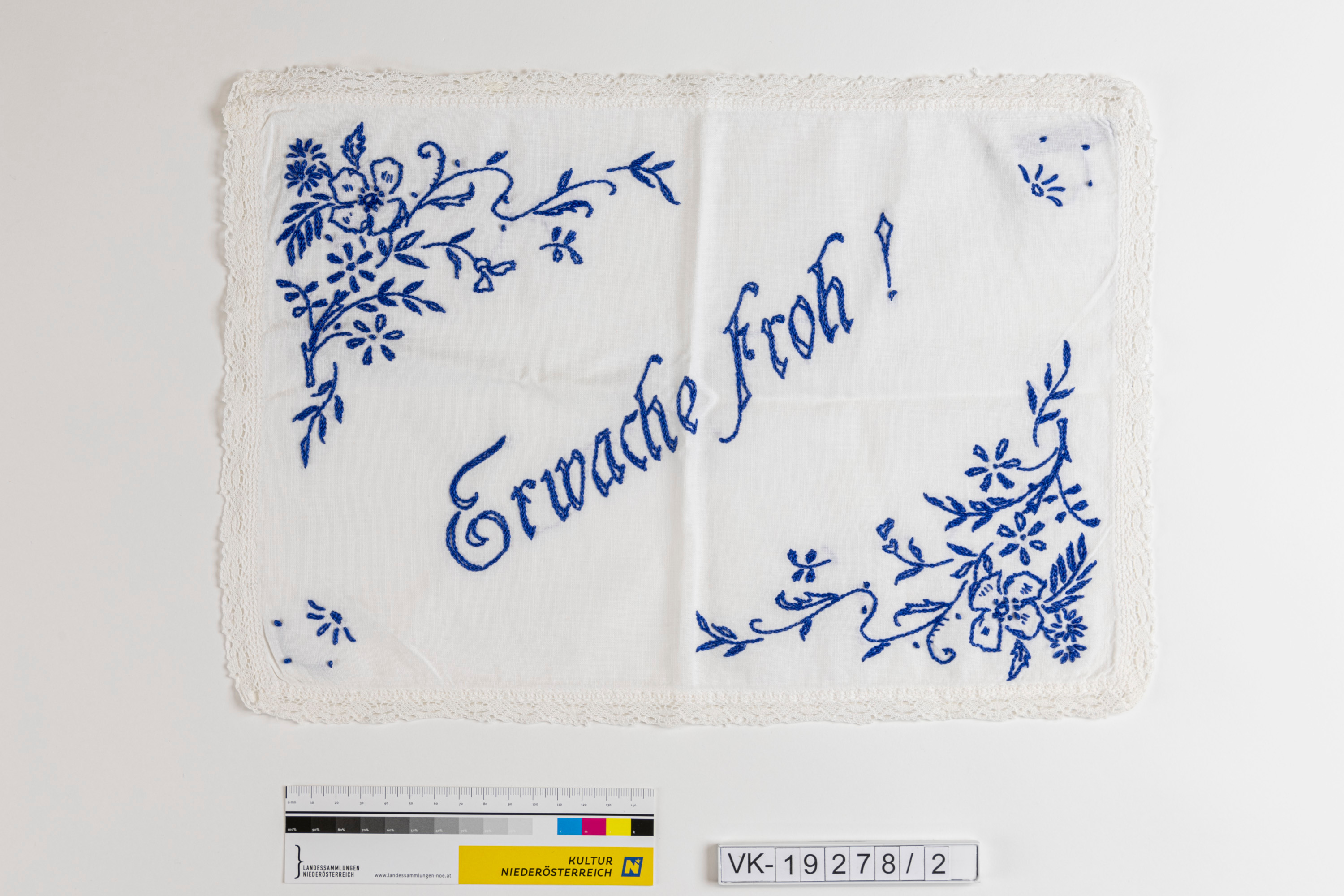 Rechteckiges weißes Leinendeckchen für ein Nachtkästchen, umlaufend mit einer weißen Spitzenborte besetzt, blau bestickt: Florale Motive in zwei Ecken, dazwischen schräg verlaufend: "Erwache froh!"