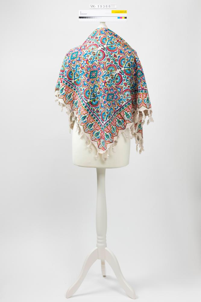 Vollständig mit einem mehrfärbigen ornamentalen Muster bedrucktes weißes Tuch mit eingedrehten Fransen.