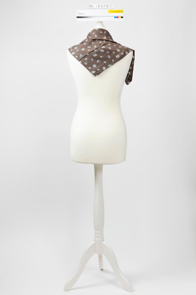 Seidentuch mit brauner Grundfarbe und aufgedruckten Edelweißblüten. Das Tuch hat ein kleines Etikett mit der Aufschrift: "hubegger WIEN".