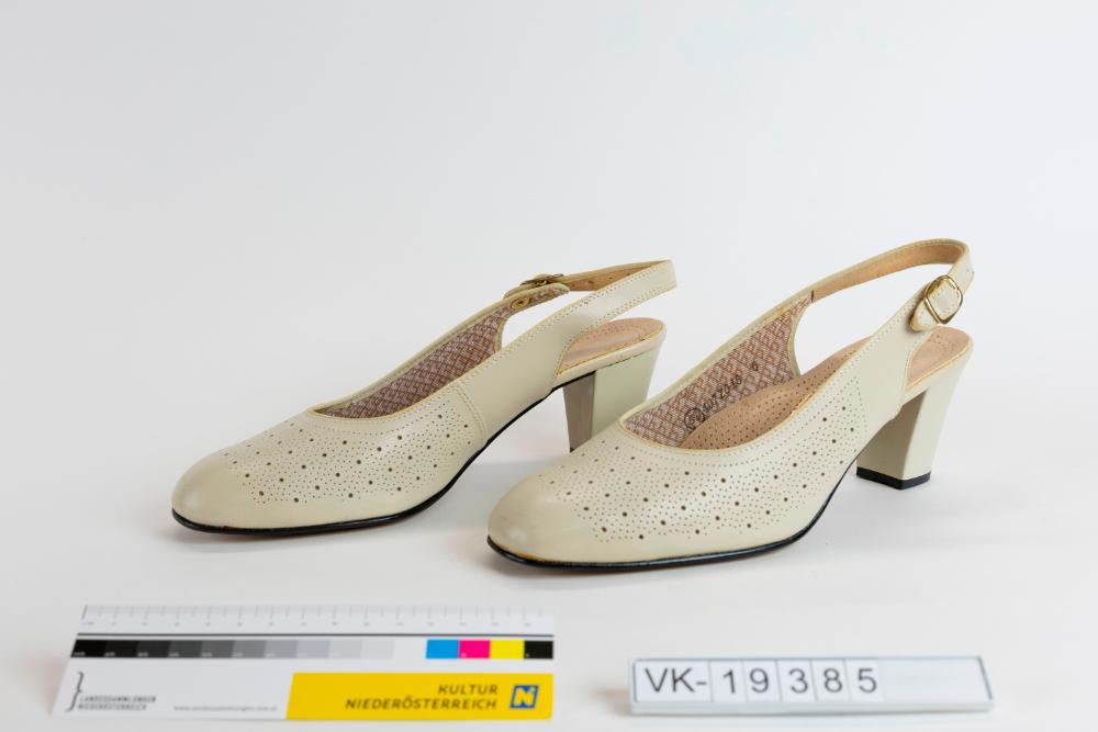 Ein Paar Damenschuhe (a, b) mit Fersenriemchen, aus hellem Leder, das im vorderen Bereich gelocht ist. Im Fußbett befindet sich eine Beschriftung: "Garant-Schuh".
