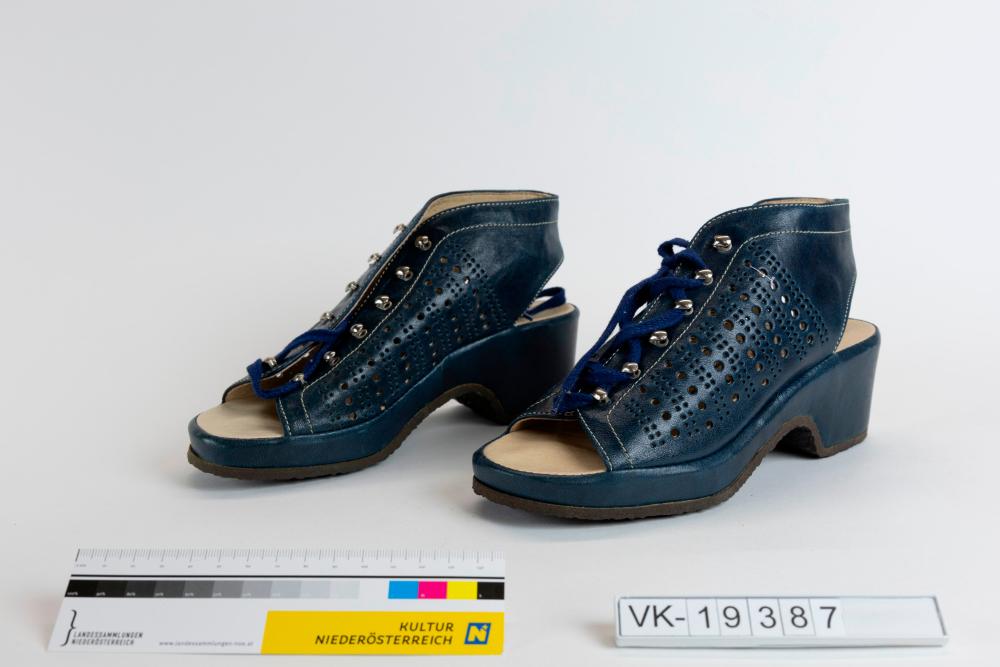 Ein Paar knöchelhohe Damenschuhe (a, b) mit Zehen- und Fersenöffnung, ohne Zunge mit Hakenschnürung und Gummisohle. Die Schuhe sind außen dunkelblau und innen hellbraun, das Fußbett ist bedruckt: "modissa von Rohde Wörishofen".