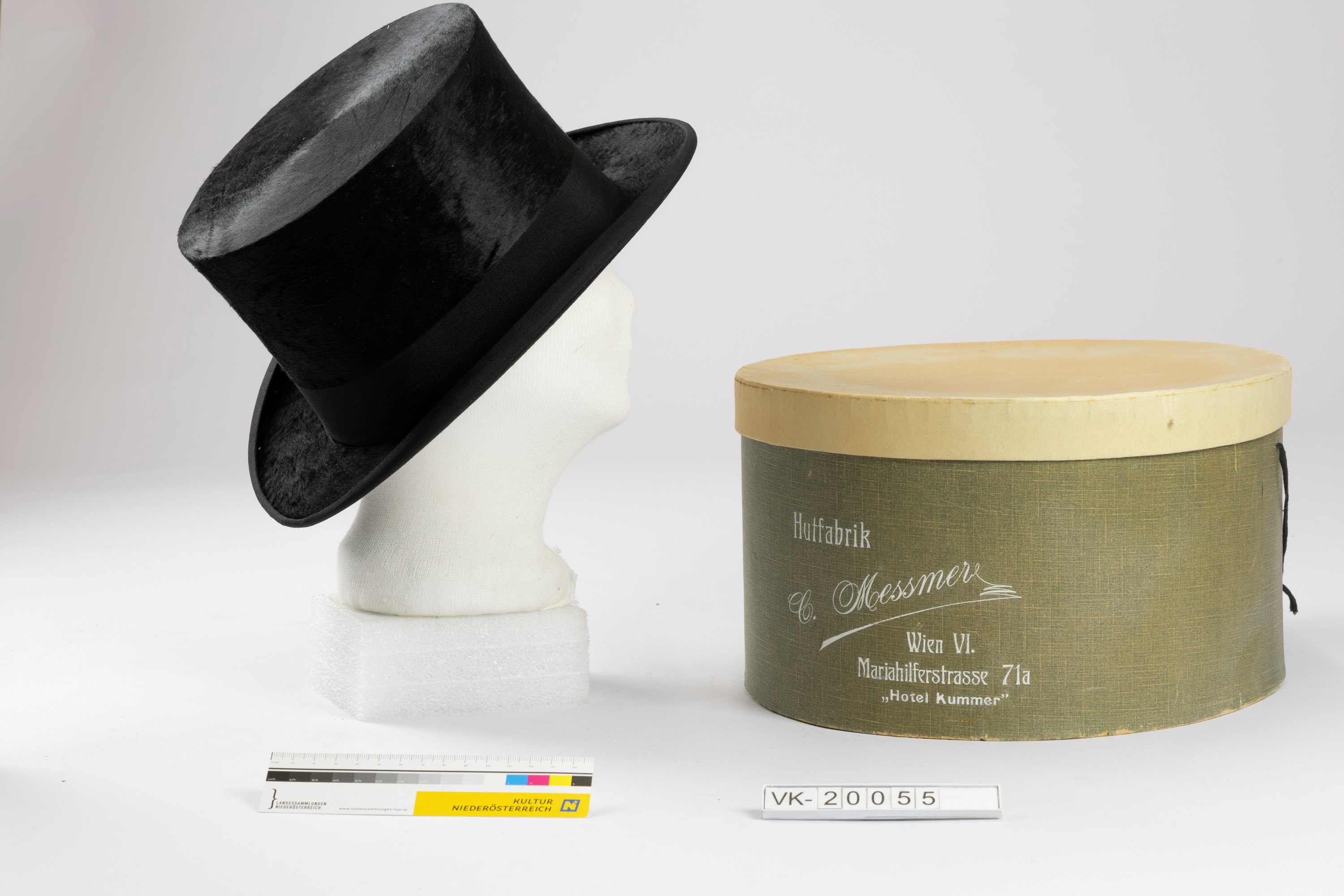 Schwarzer Filzzylinder (VK-20055a) mit Lederschweißband und weißem Moireefutter, darauf ein Aufdruck: "C. MESSMER GEGRÜNDET 1790 HOTEL KUMMER WIEN VI. MARIAHILFERSTR. 71". Dazu eine runde Hutschachtel (VK-20055b und VK-20055c) aus Karton, grün mit beigem Deckel. Die Schachtel ist bedruckt: "Hutfabrik C. Messmer Wien VI. Mariahilferstrasse 71a Hotel Kummer".