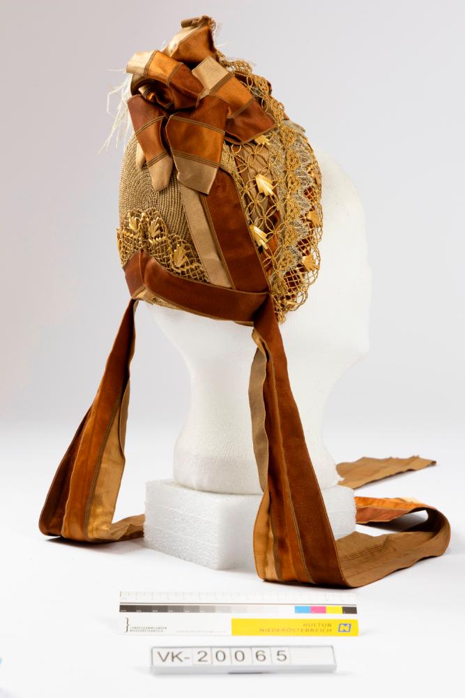Haube aus gelber und weißer Spitze, mit weißem Leinen gefüttert. In die gelbe Spitze sind Strohverzierungen eingeflochten, die Haube ist mit einer weißen Straußenfeder und einer Schleife mit langen Bändern aus in Brauntönen gestreiftem Taftband verziert. Die Haube hat eine Drahtverstärkung. Der Boden ist aus Stroh geflochten.