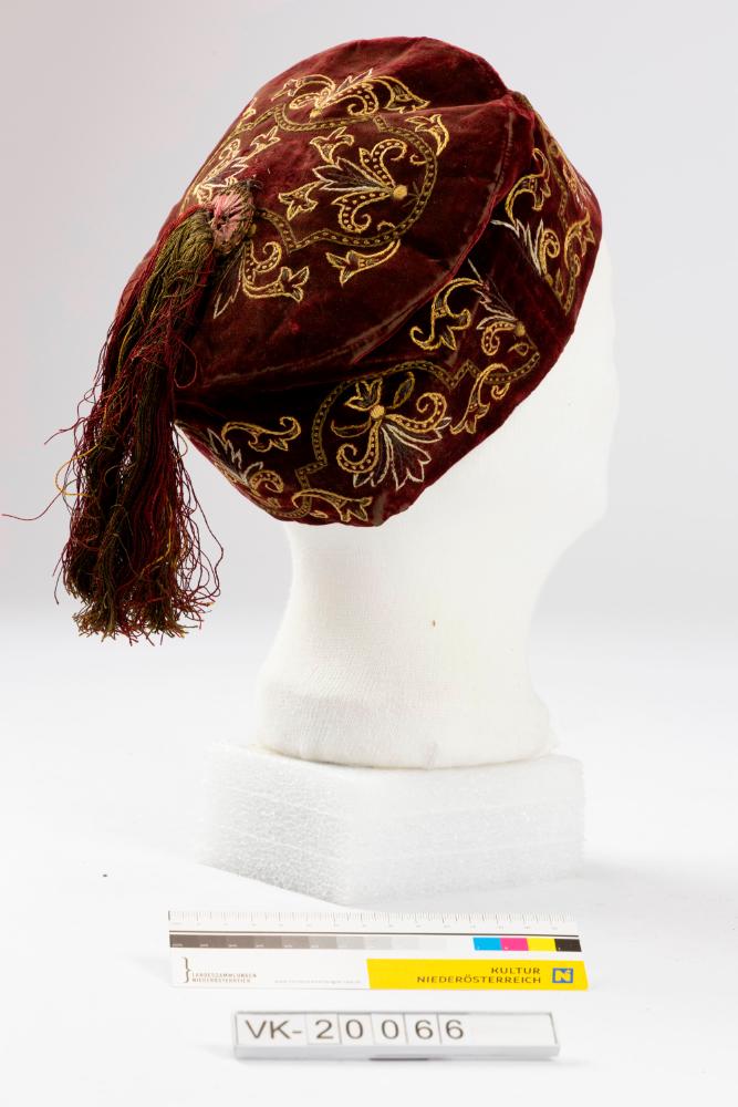 Zylindrische Hauskappe aus rotem Samt, in Gelb- und Goldtönen floral-ornamental bestickt, mit schwarzer Seide gefüttert. Die Kappe hat in der Mitte eine mehrfärbige Quaste.