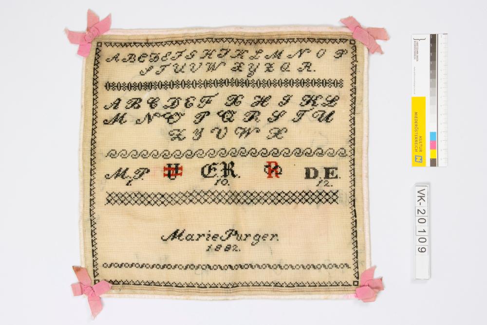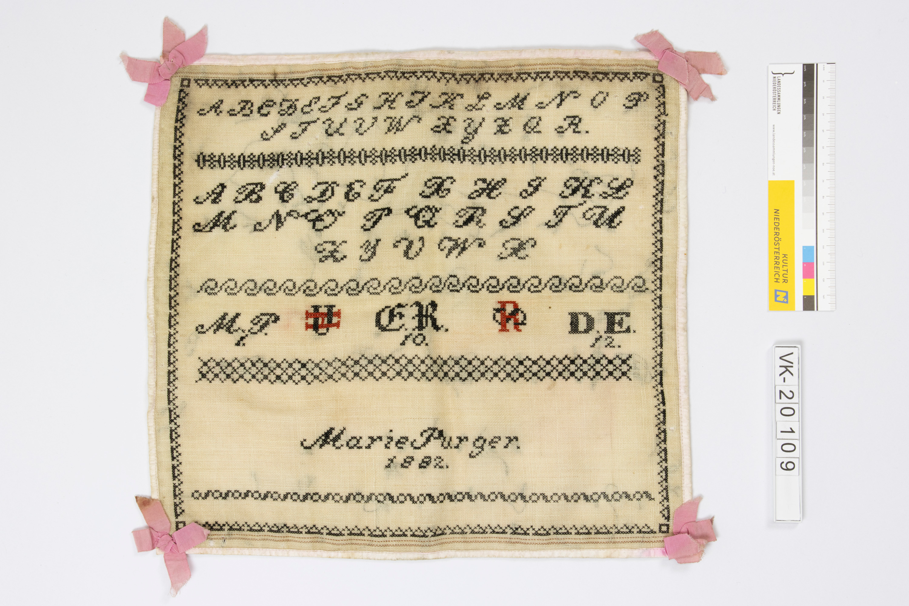 Beiges Aidastofftuch, schwarz und rot im Kreuzstich mit Zierborten und Alphabeten, dazu "Marie Purger 1882". Die Rückseite des Tuchs ist mit weißem Feinleinen besetzt, in jeder Ecke ist eine rosa Taftschleife befestigt.