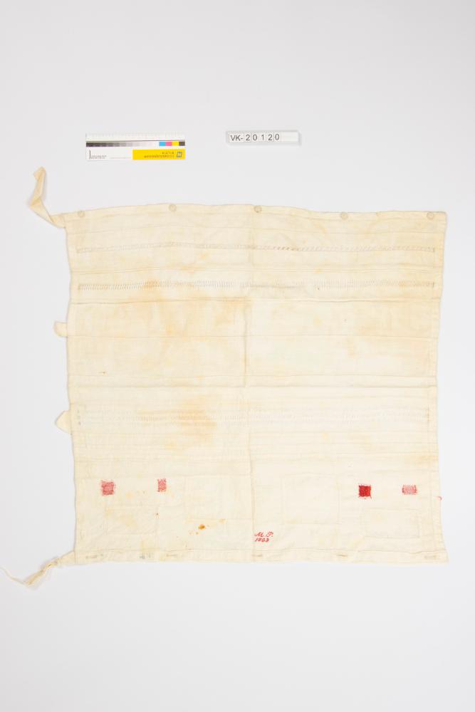 Mustertuch aus weißem Feinleinen: Das Tuch hat Ajourborten, Biesen, eine Knopfleiste mit Zwirnknöpfen, eingesetzte Flicken und eine rote Bestickung im Kreuzstich: "MP 1883". Vermutlich von Marie Purger.