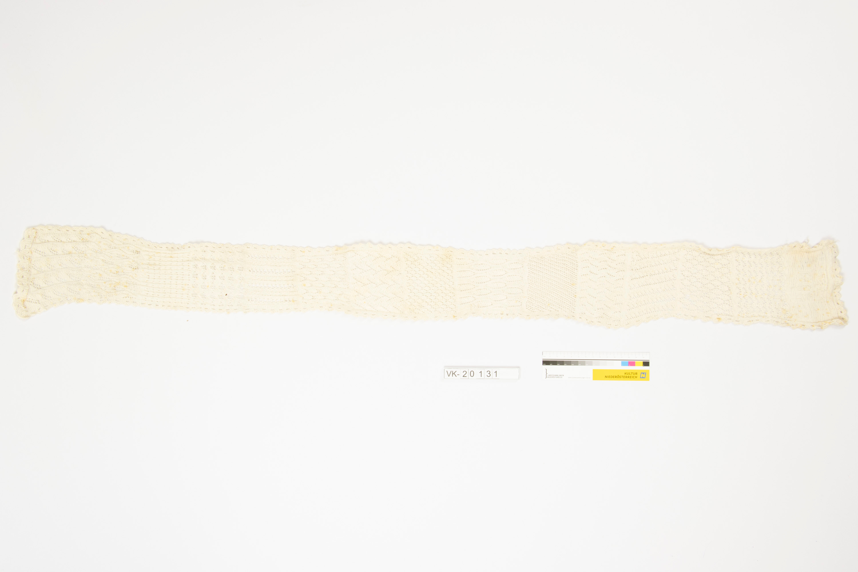 Weißes langes Strickmusterband mit unterschiedlichen, großteils durchbrochen ausgeführten Strickmustern, mehrheitlich geometrische Muster.