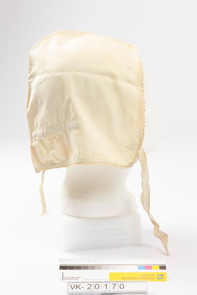 Weiße Schlafhaube mit umlaufendem schmalem Häkelspitzenbesatz, einem Zugbändchen im Nacken und weißen Köperbändern zum Binden.
