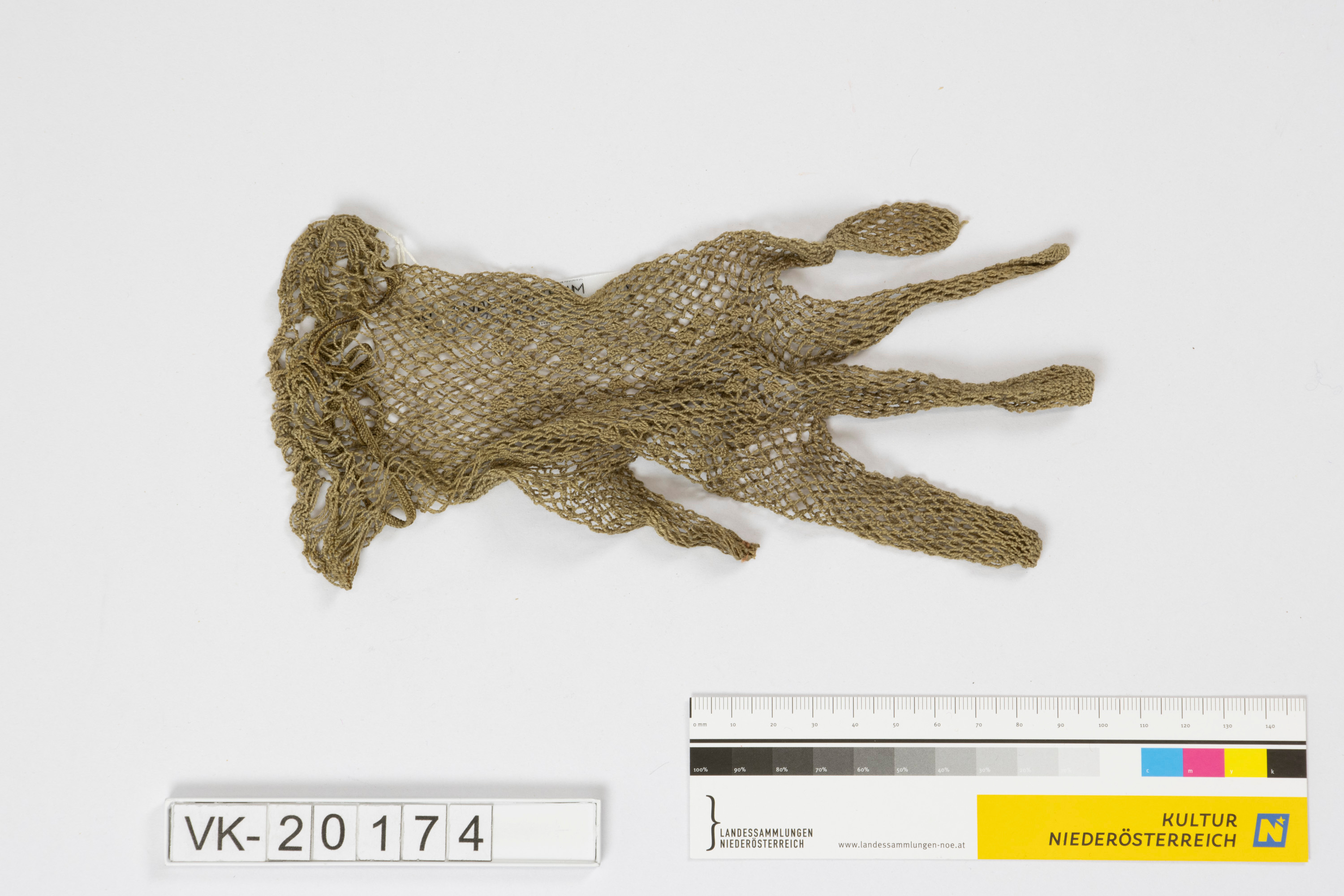 Im Netzmuster gehäkelter brauner Damenhandschuh mit einem Zugbändchen.