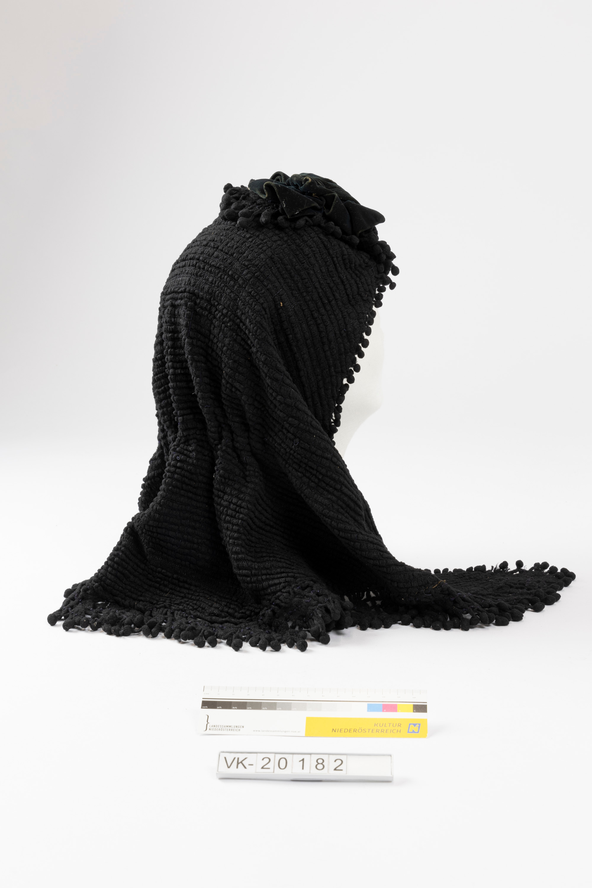 Schwarze Wollhaube mit Bommelbesatz, blauem Leinenfutter und einer schwarzen Samtmasche am Kopf.