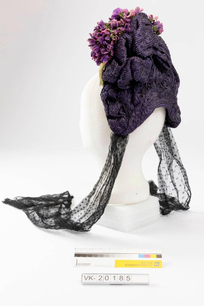 Aus violettem Seidengarn gestrickte und in Rüschen gestaltete Bodenhaube mit violettem Kunstblumenbesatz und zwei langen schwarzen Tüllbändern. Die Haube ist mit schwarzer Seide gefüttert, im Futter ist ein goldener Herstelleraufdruck angebracht.