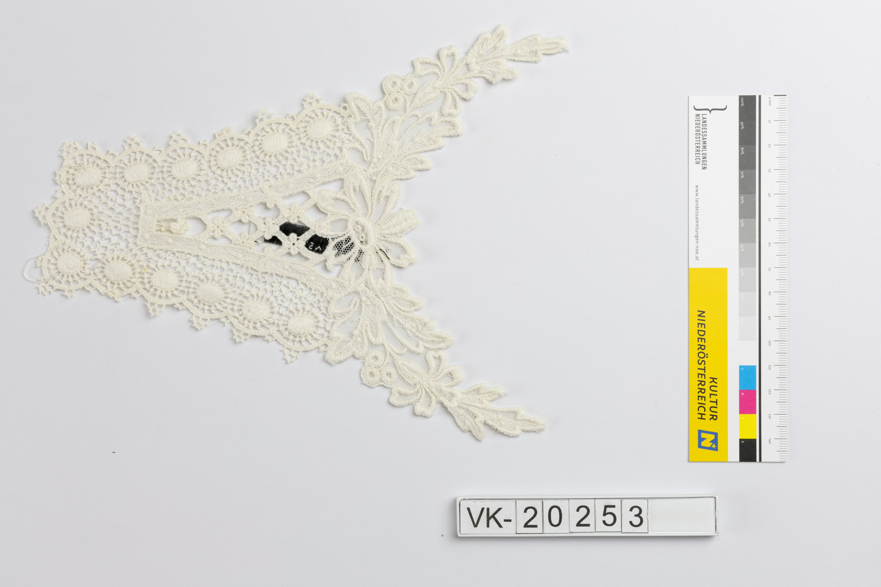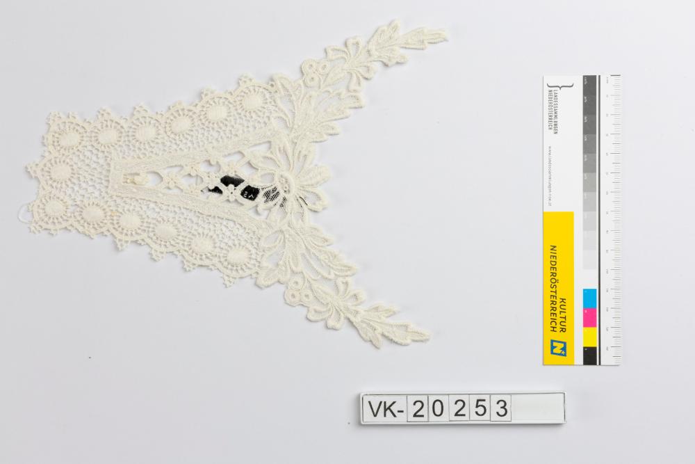 Annähernd dreieckiger, im oberen Bereich floral gestalteter, weißer Nadelspitzeneinsatz, vermutlich als Brusteinsatz für eine Bluse oder ein Kleid zu verwenden. Könnte zu VK-20252 gehören.