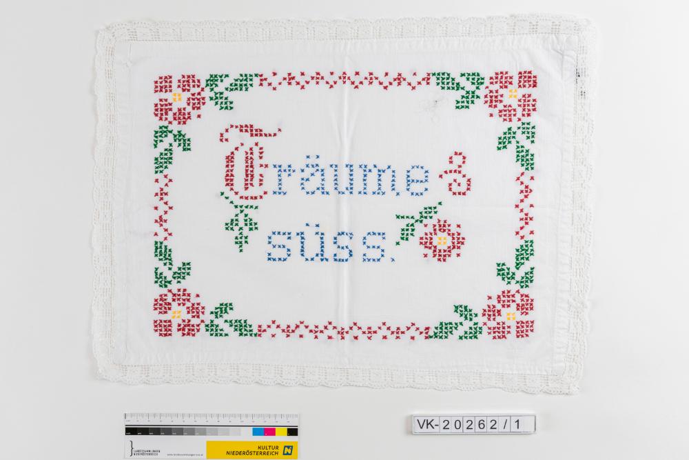 Rechteckiges weißes Deckchen, umlaufend mit weißer Spitze besetzt, mehrfärbig im Kreuzstich bestickt mit einem floralen Rahmen und einer Beschriftung: "Träume süss".