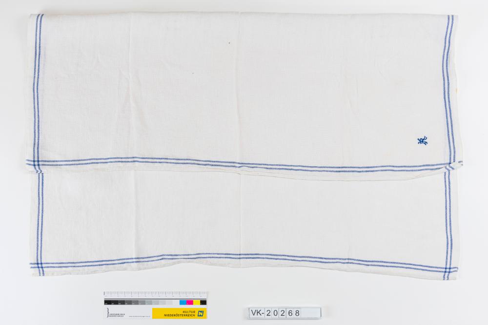 Weißes Geschirrtuch mit schwarzen Linien am Rand und einer schwarzen Monogrammstickerei: "KR" oder "KA". Monogramm wie auf VK-20267.