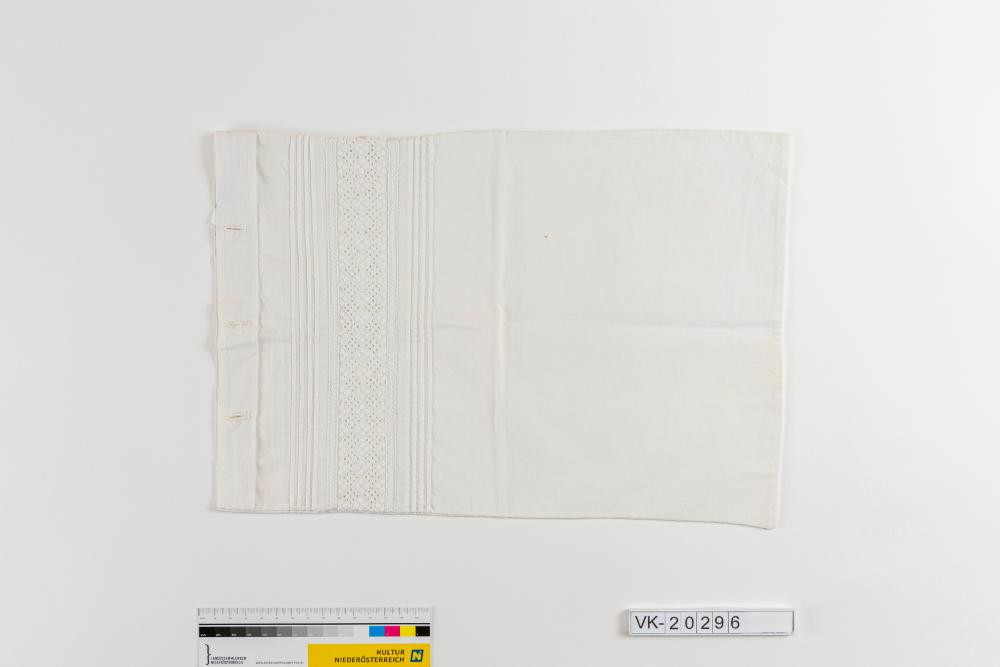 Weißer kleiner Leinenpolsterüberzug, geknöpft, mit einem quer eingesetzten Wäschespitzenband, zu beiden Seiten davon Biesenzier.