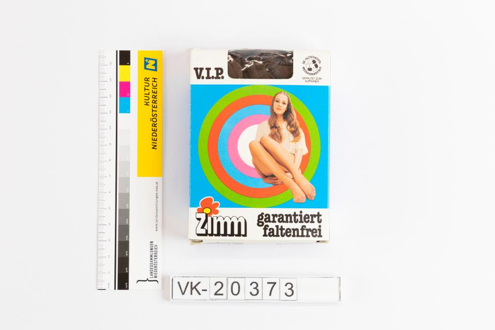 Schwarze Strumpfhose, original verpackt in einer Kartonschachtel. Die Schachtel ist mehrfärbig bedruckt, auf der Vorderseite konzentrische Kreise, Foto einer Frau, "V. I. P. Zimm garantiert faltenfrei". Auf dem Karton finden sich weitere Hinweise zur Abfallverwertung und Waschanweisungen, die Schachtel hat ein Sichtfenster mit klarem Kunststoff. Das Objekt befand sich in der Schachtel, die mit XT 2 bezeichnet wurde.