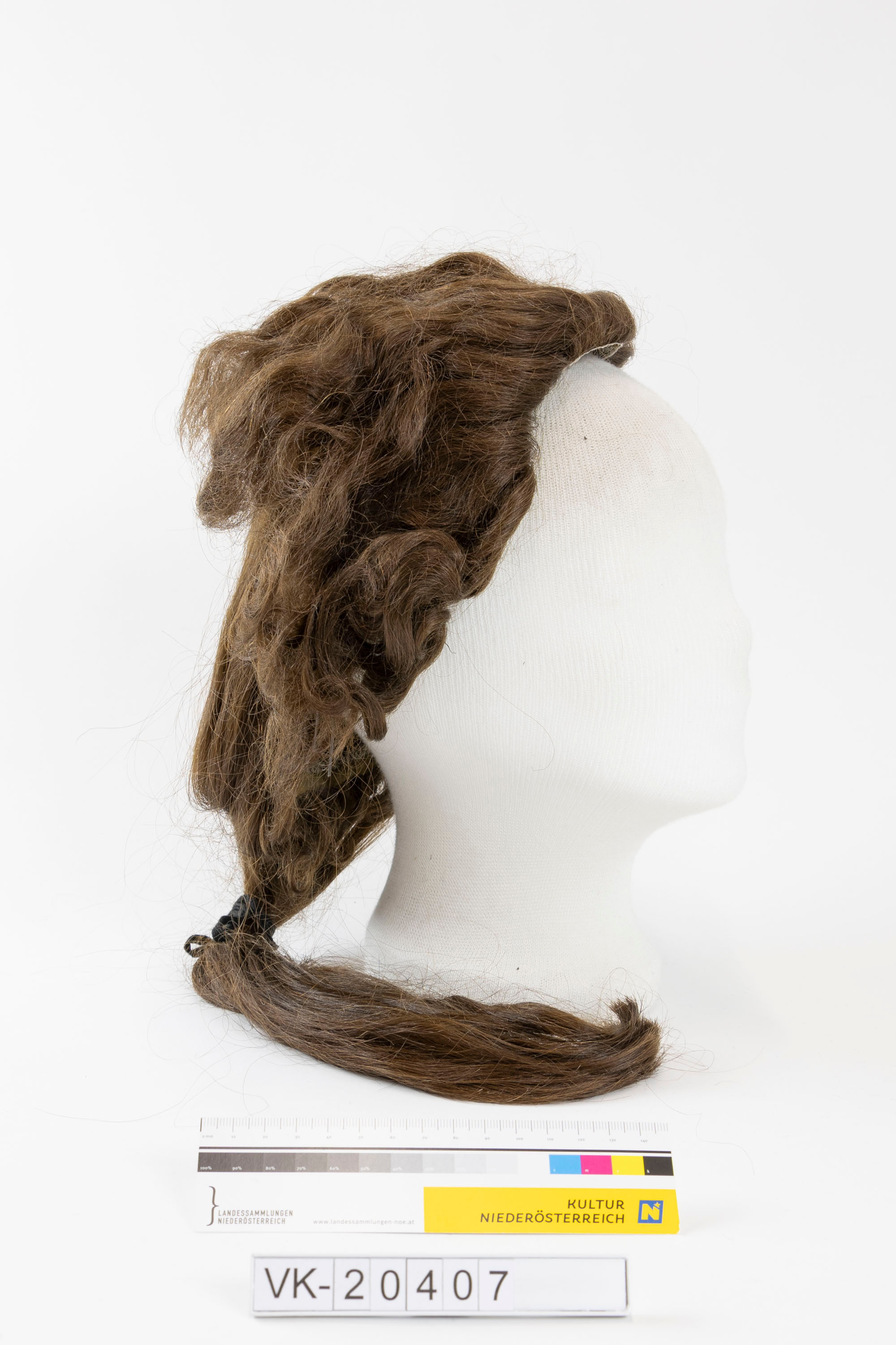 Dunkelbraune Damenfrisurperücke, geflochtenes Haar, im Nacken gebunden.