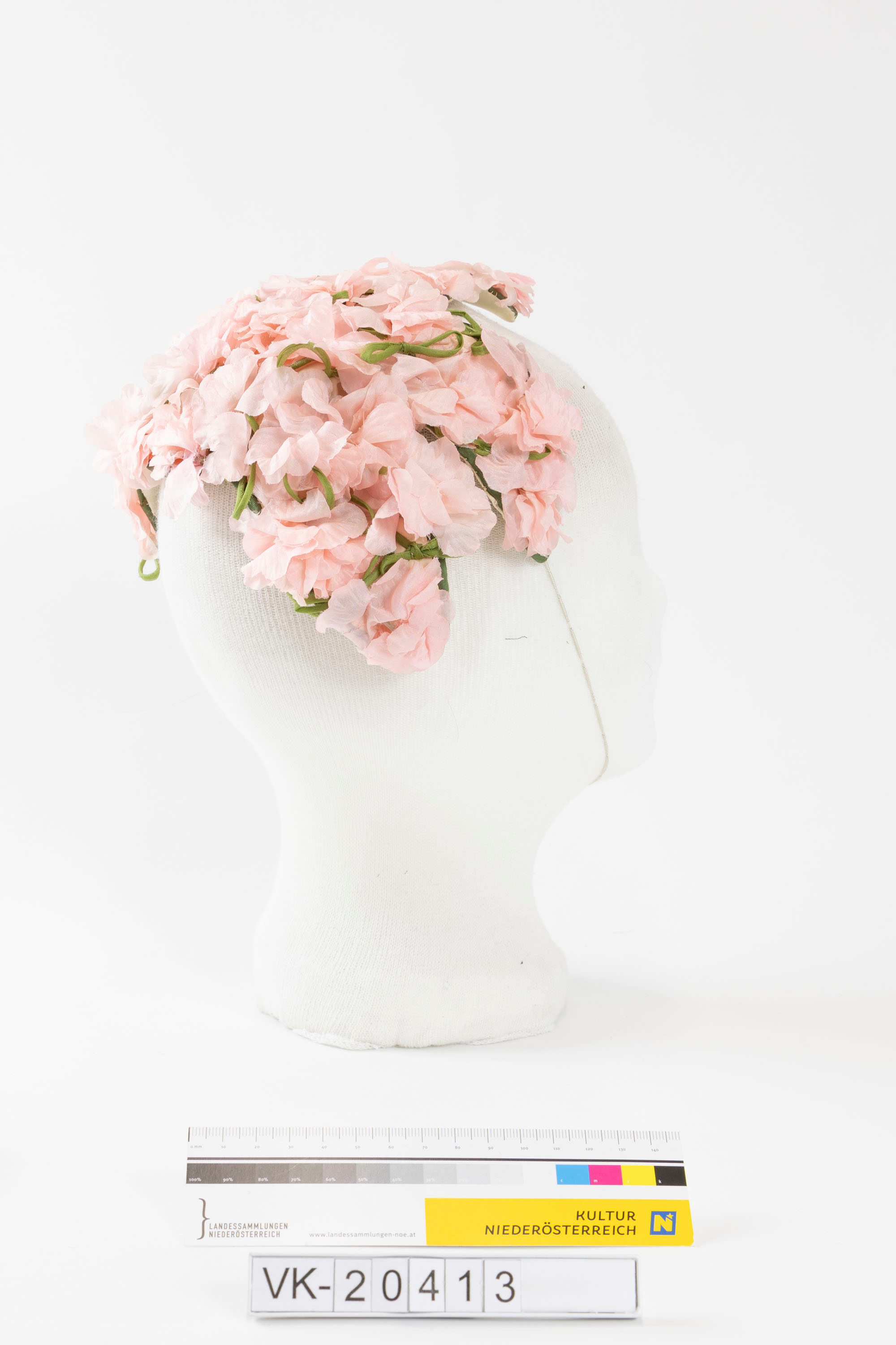 Kopfschmuck (Blumenkranz, möglicherweise Hochzeit), gefüttert mit weißem Seidenrips, mit grünen Ripsbändern gefasst. Der Kopfschmuck ist vollflächig mit rosa Stoffblüten, dazwischen grüne Bändchen, besetzt. Zur Befestigung dient ein weißes Gummiband.