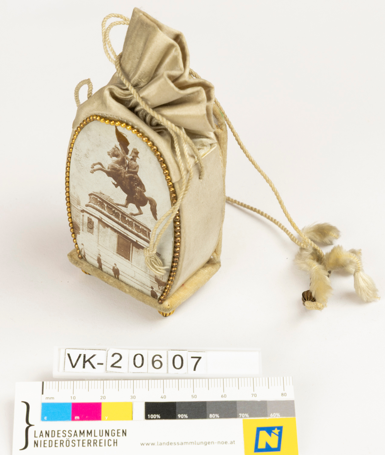 Ballspende mit Tanzordnung: Mit beigem Seidenstoff bezogener verstärkter Beutel, mit vier Messingfüßchen, auf einer Seite mit einer aufgeklebten Fotografie (Reiterstatue), auf der anderen Seite mit Tanzordnung. Die Ballspende hat eine beige Posamentriekordel, die Tanzordnung fehlt bis auf den Einband.