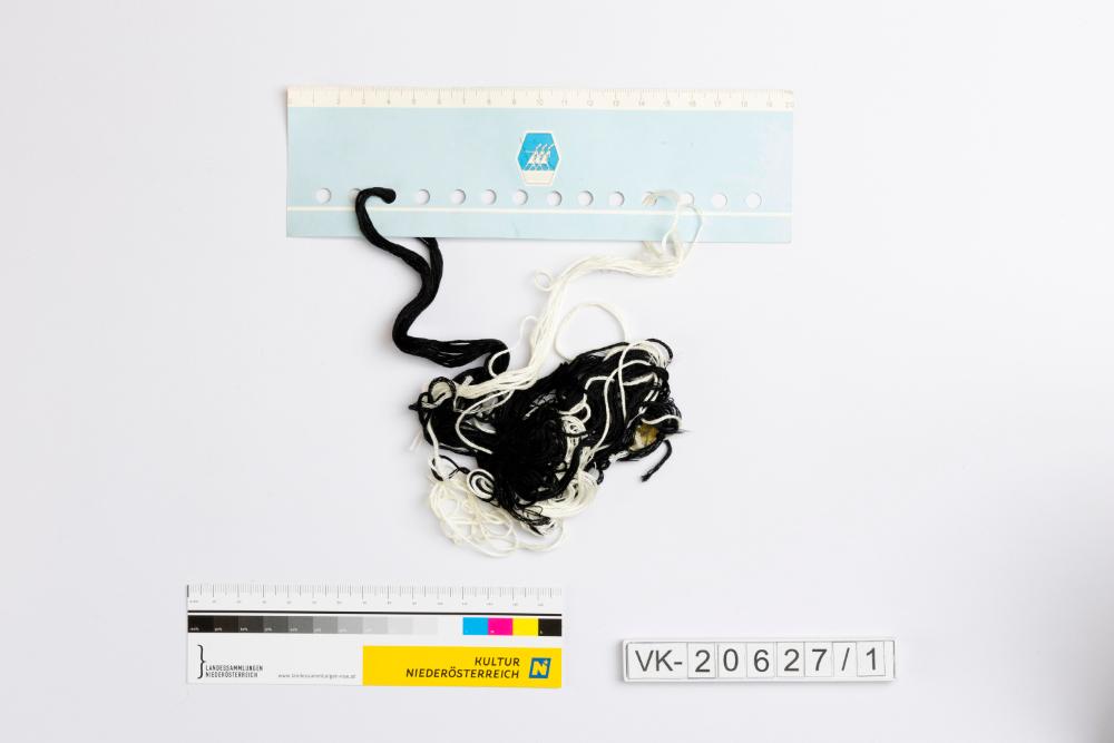 Schwarzes und weißes Stickgarn auf einem hellblauen Kartonbriefchen mit Lochreihe und aufgedrucktem Maßband. Zu den Garnen gehört vermutlich die Stickanleitung VK-20632.