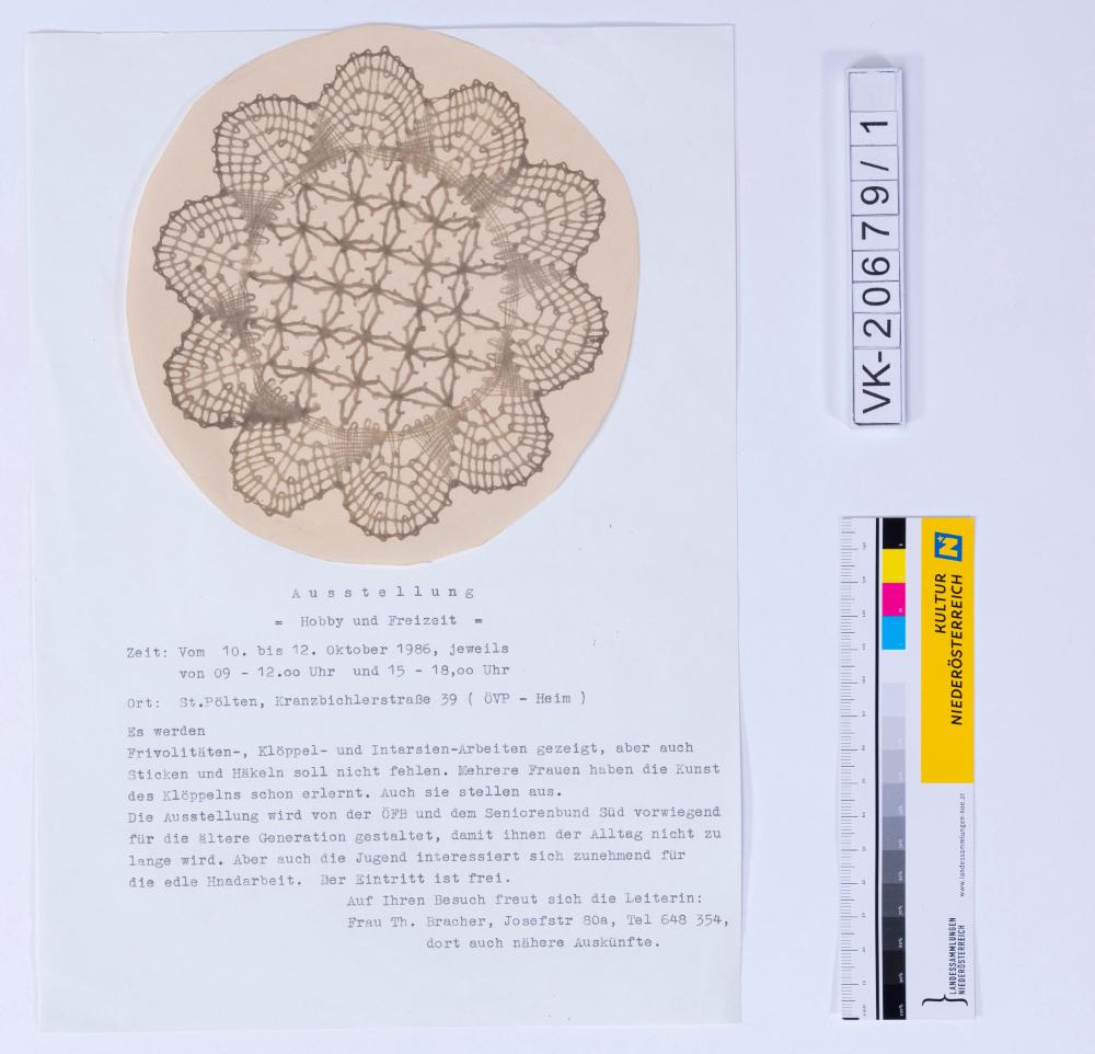 Ankündigung der Ausstellung "Hobby und Freizeit" vom 10. bis 12. Oktober 1986 im ÖVP-Heim, Kranzbichlerstraße 39, St. Pölten. Fr. Therese Bracher organisierte eine Handarbeitsausstellung mit dem ÖFB und dem Seniorenbund Süd. Das Blatt ist mit Schreibmaschine geschrieben, im oberen Drittel ist die Kopie eines Spitzendeckchens aufgeklebt. Fr. Bracher veranstaltete in den 1970er- und 1980er-Jahren Klöppelkurse über den ÖFB.
