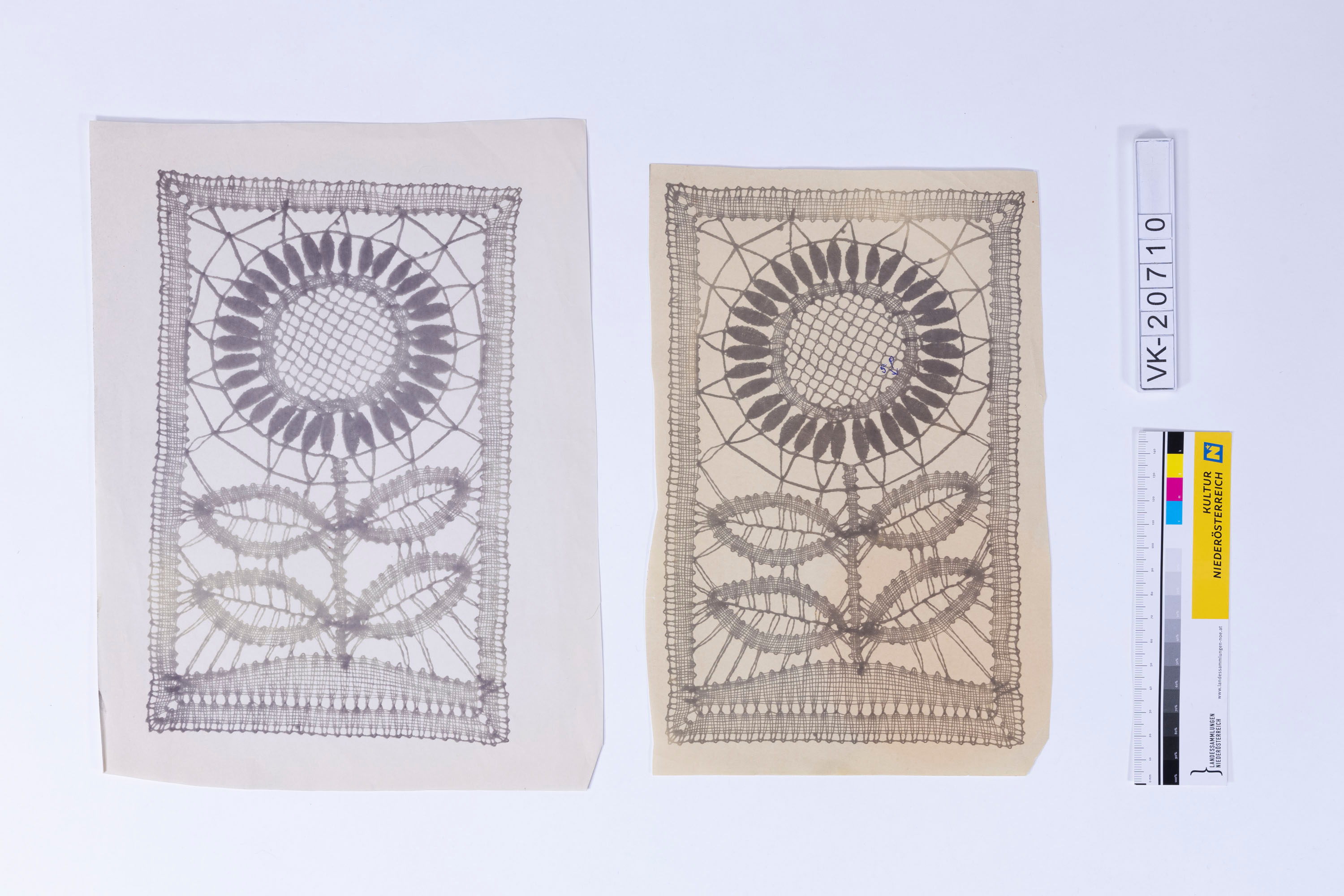 Zwei Abbildungen eines rechteckigen Spitzendeckchens mit Sonnenblumenmotiv (belichtetes Fotopapier), für einen Klöppelbrief. Das Muster entspricht dem Muster beim Objekt VK-20733. Fr. Bracher veranstaltete in den 1970er- und 1980er-Jahren Klöppelkurse über den ÖFB.